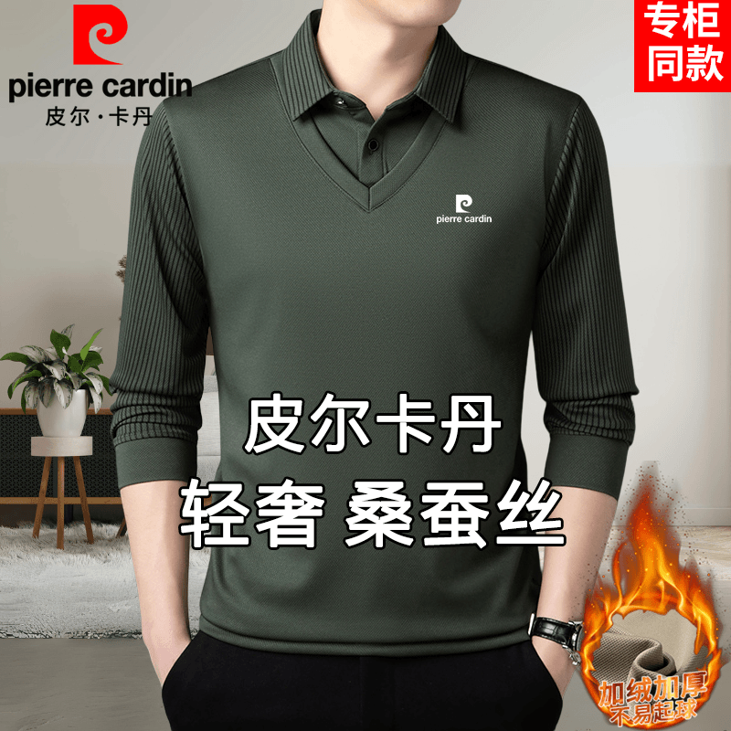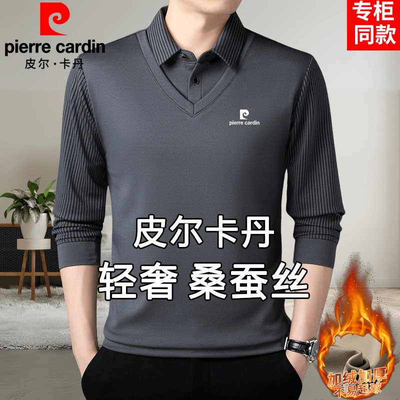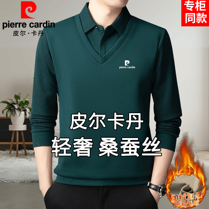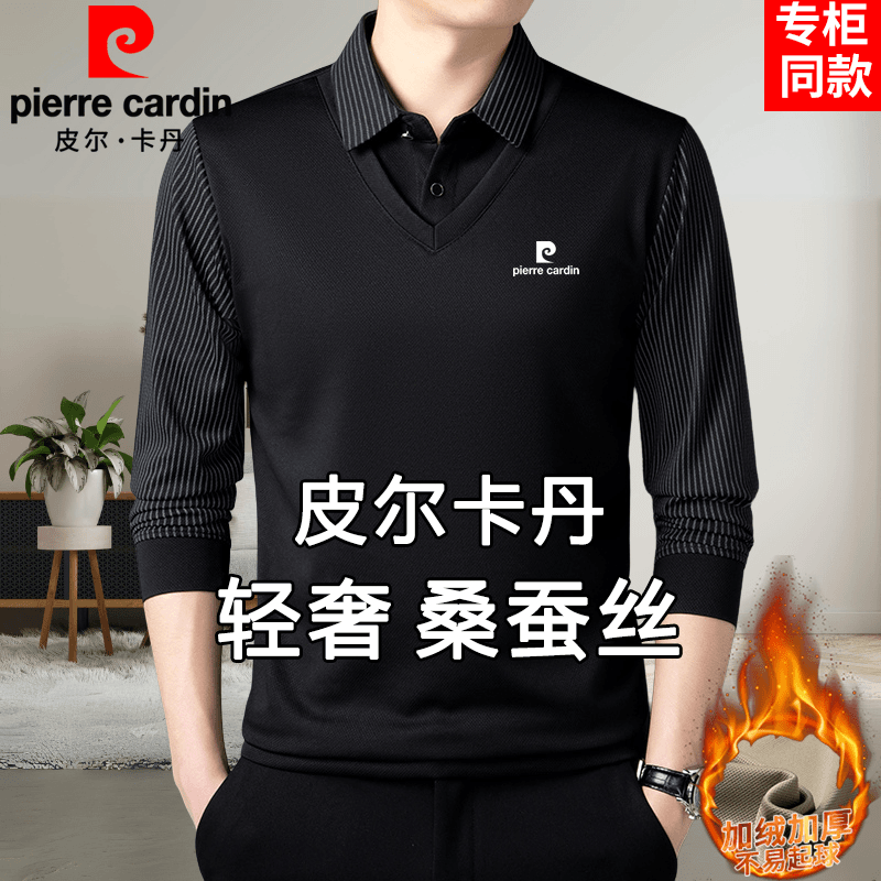 皮尔卡丹加绒加厚假两件桑蚕丝长袖T恤男士针织羊绒翻领Polo衫男