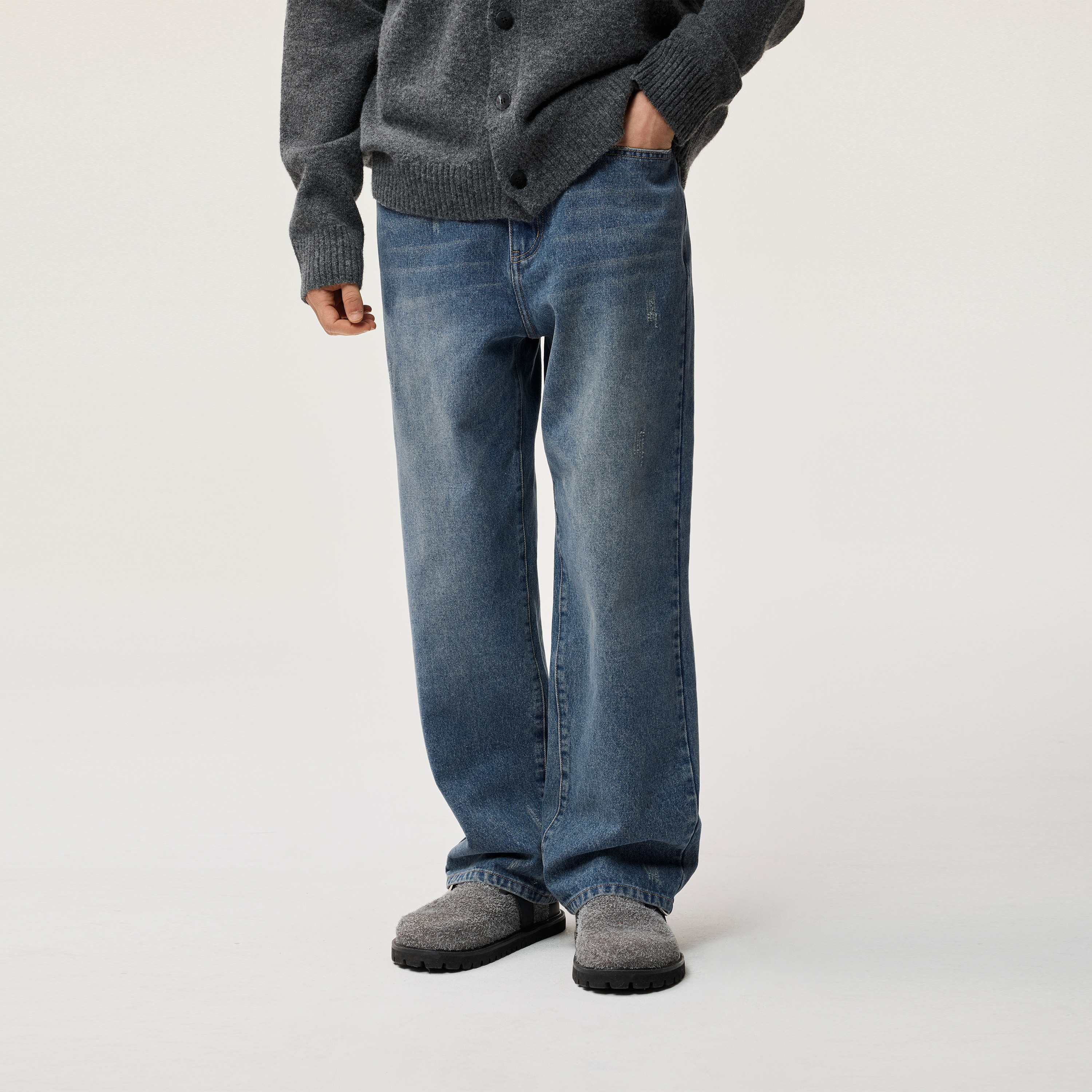 Lilbetter重磅斜纹半松紧腰牛仔长裤YKK拉链复古做旧水洗直筒裤男