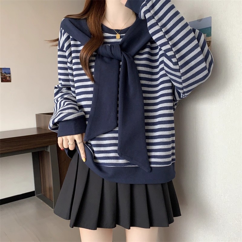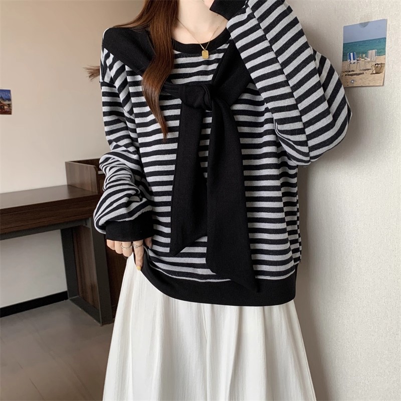 韩版圆领条纹披肩两件套长袖上衣2025新款休闲宽松圆领套头针织衫