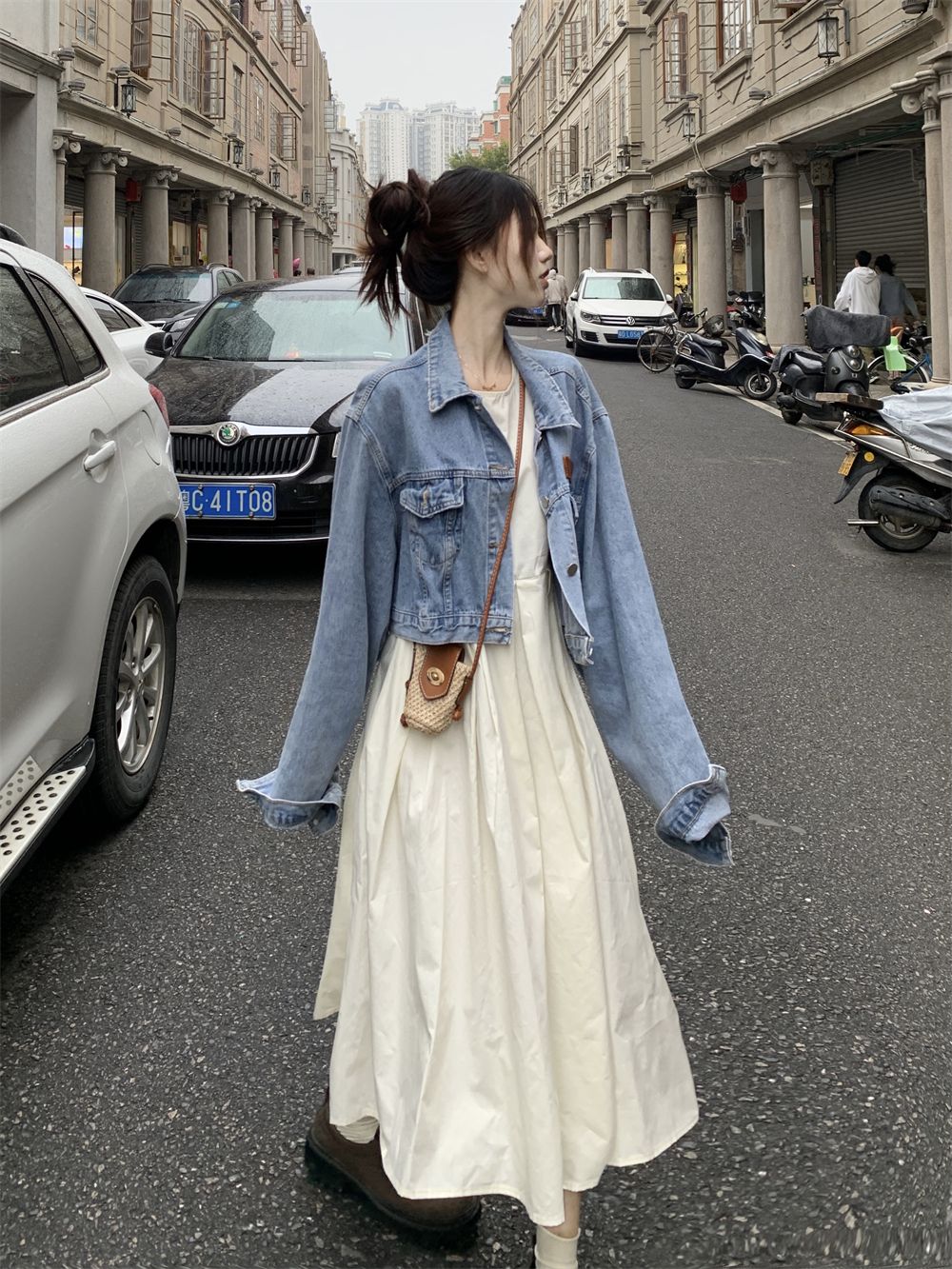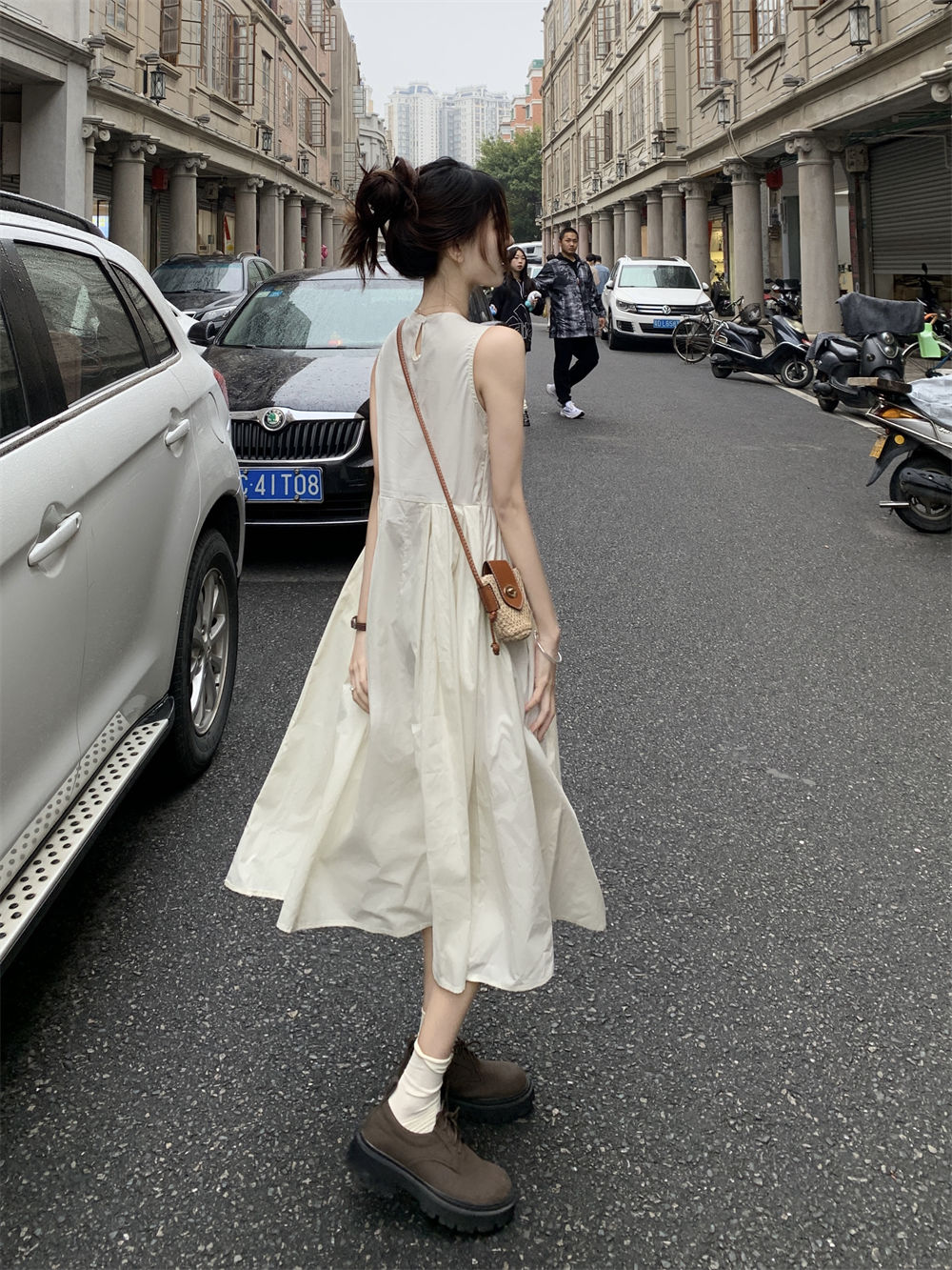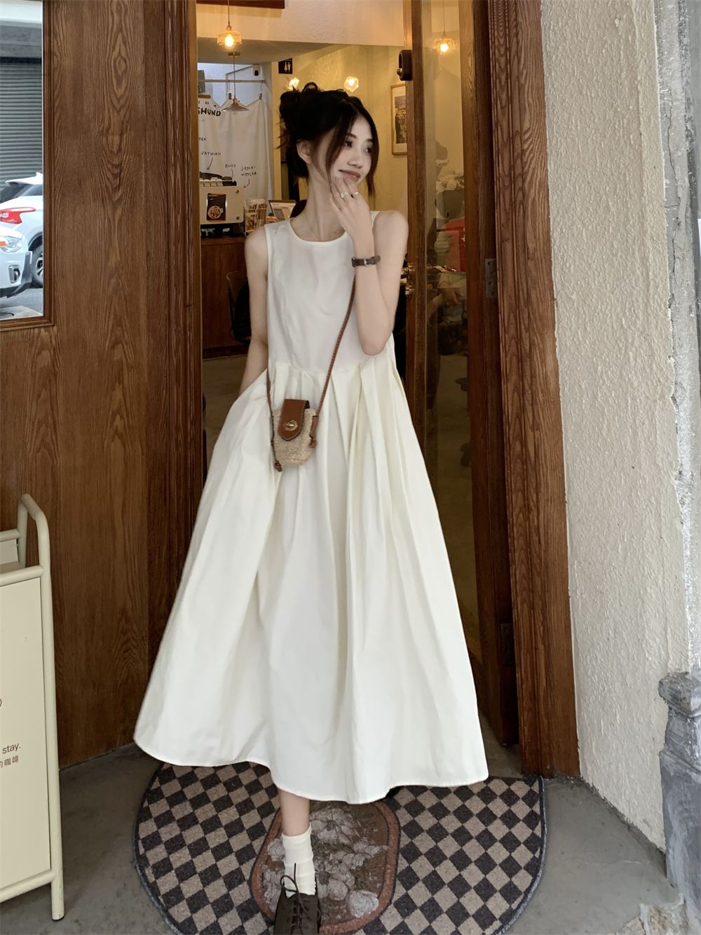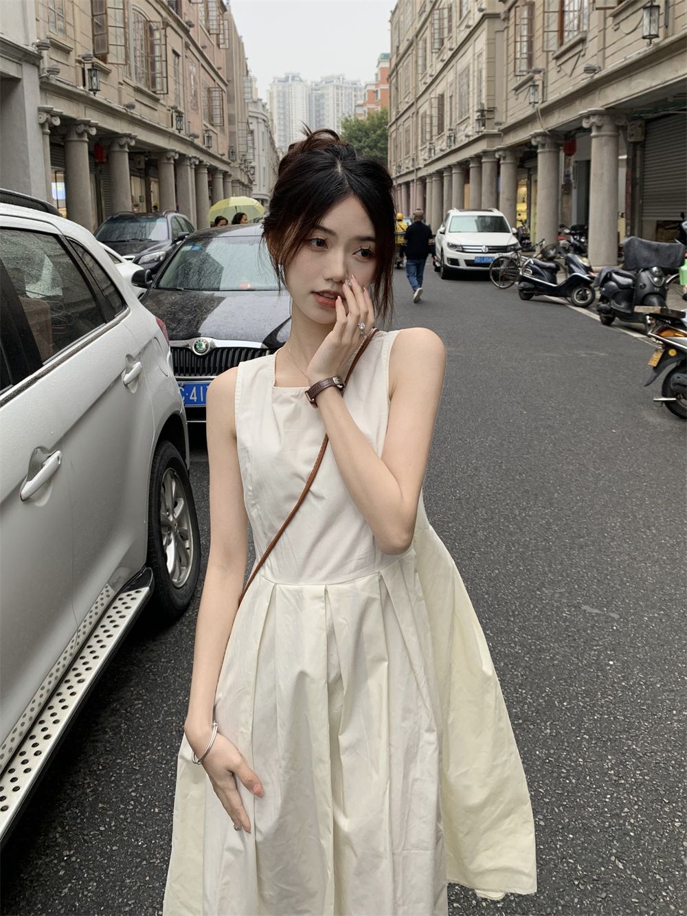 无袖背心连衣裙女夏季2023新款法式白色收腰显瘦中长款蓬蓬大摆裙