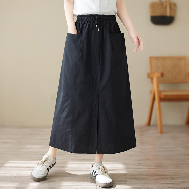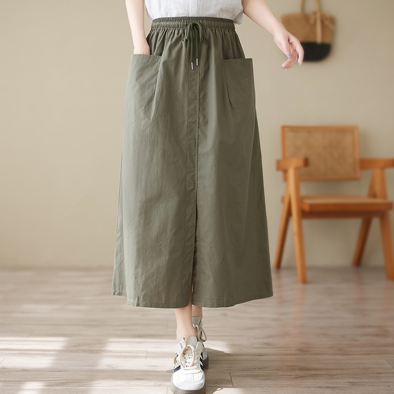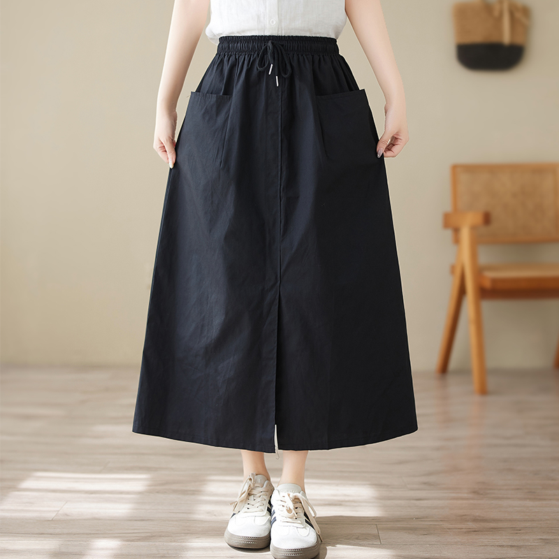 夏季新款高腰工装半身裙文艺大码中长款宽松显瘦纯色A型裙子抽绳