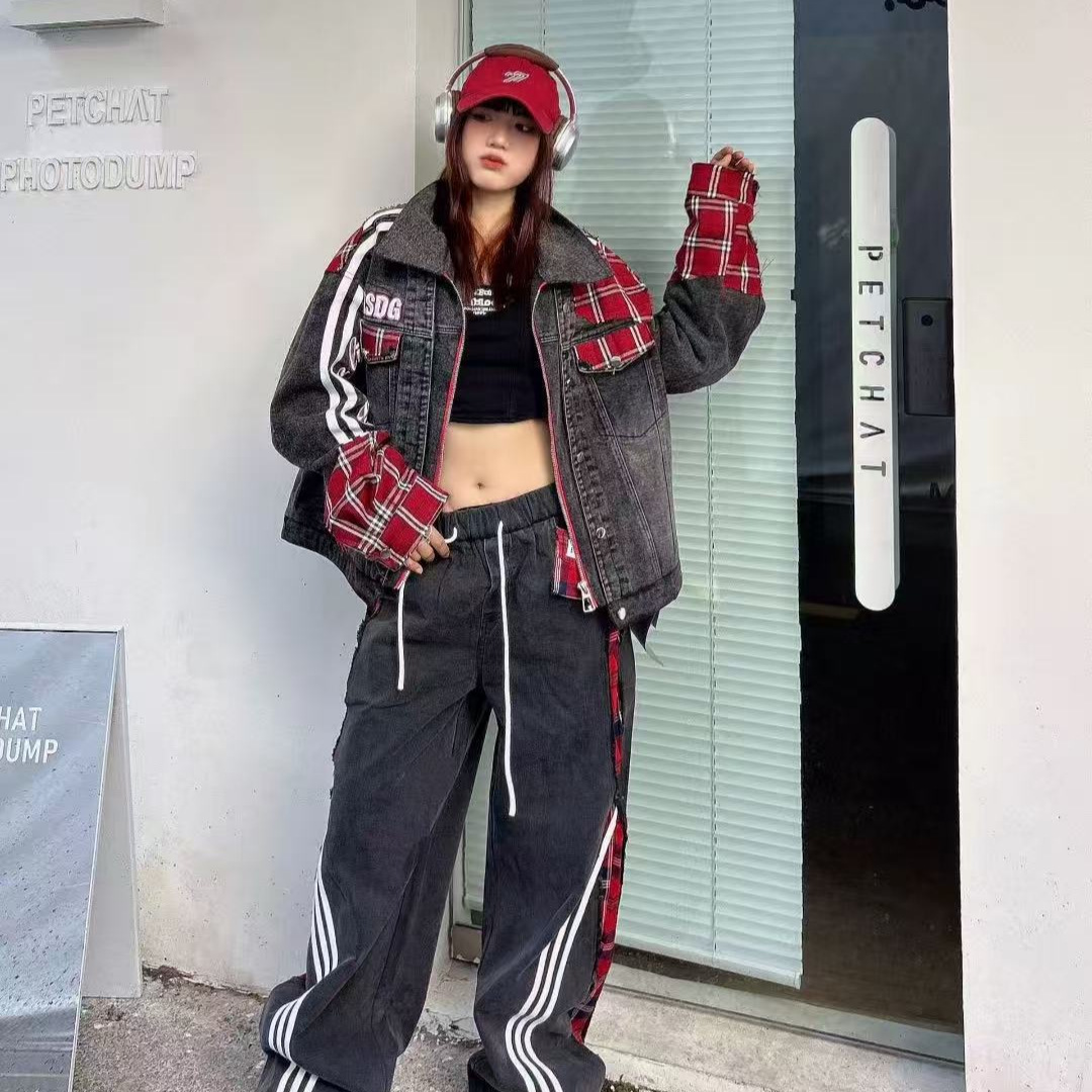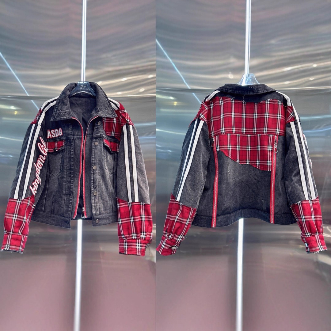 欧货牛仔外套女2025秋季新款重工格子拼接字母刺绣撞色宽松夹克潮
