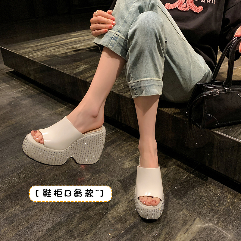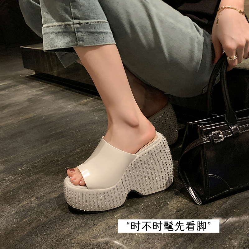 时尚外穿厚底坡跟凉拖鞋女凉鞋2024夏新款真皮水钻防水台超高跟鞋