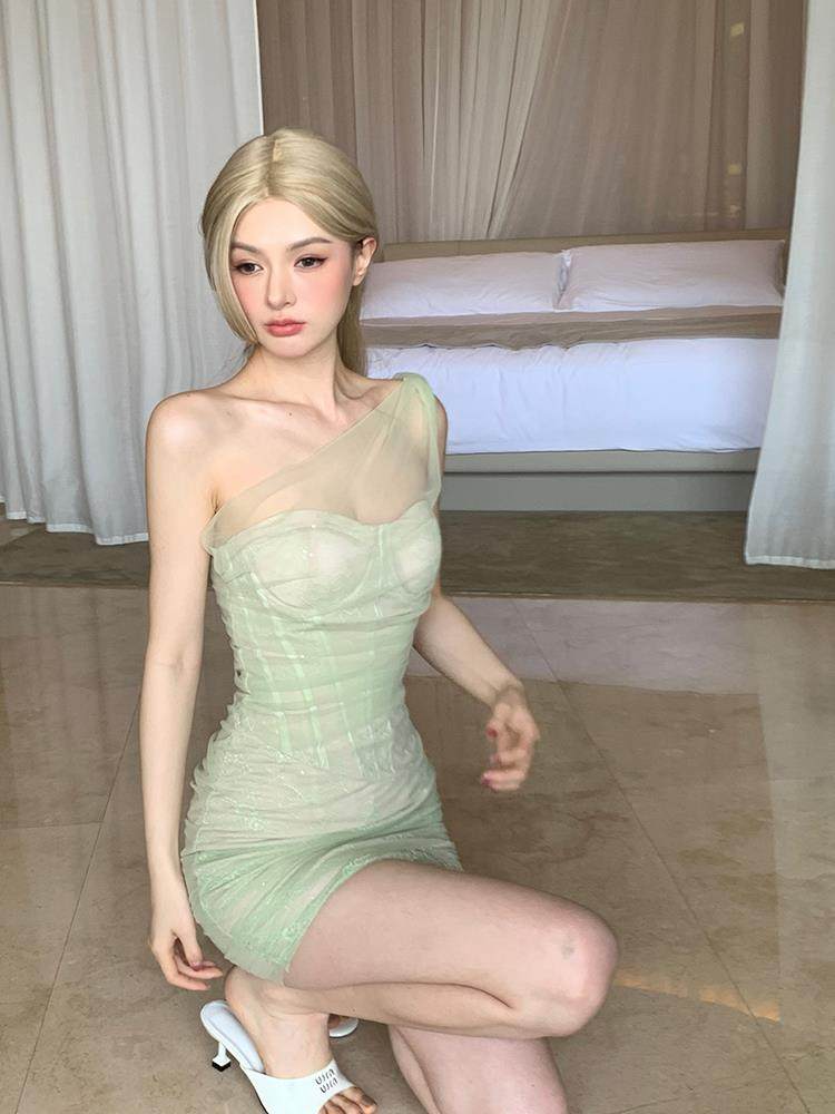 绿精灵/夏季无袖斜肩气质胸垫薄荷曼波拼接蕾丝网纱连衣裙女
