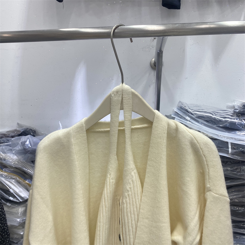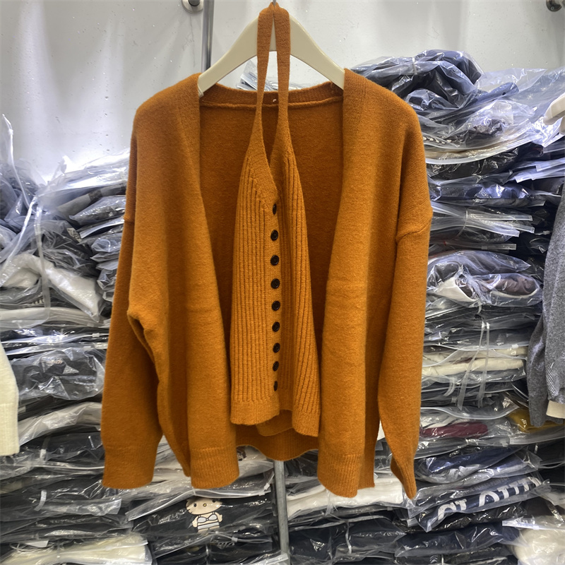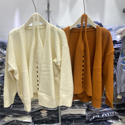 欧货女秋冬新款时尚圆领长袖针织开衫宽松显瘦挂脖背心两件套上衣
