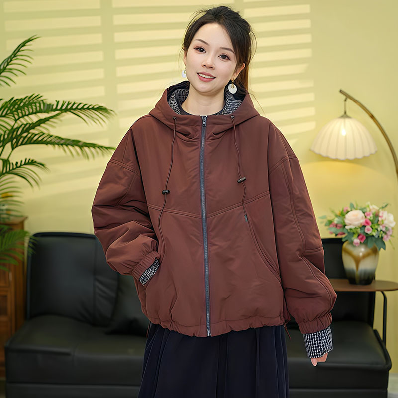 2025秋冬季新款撞色棉衣宽松设计感韩版时尚连帽短款棉服外套棉袄