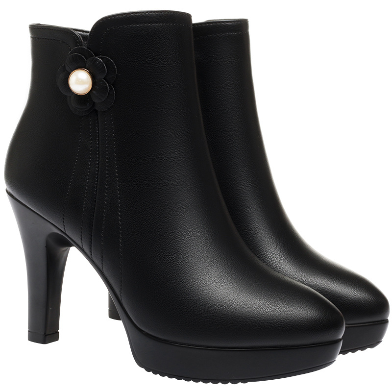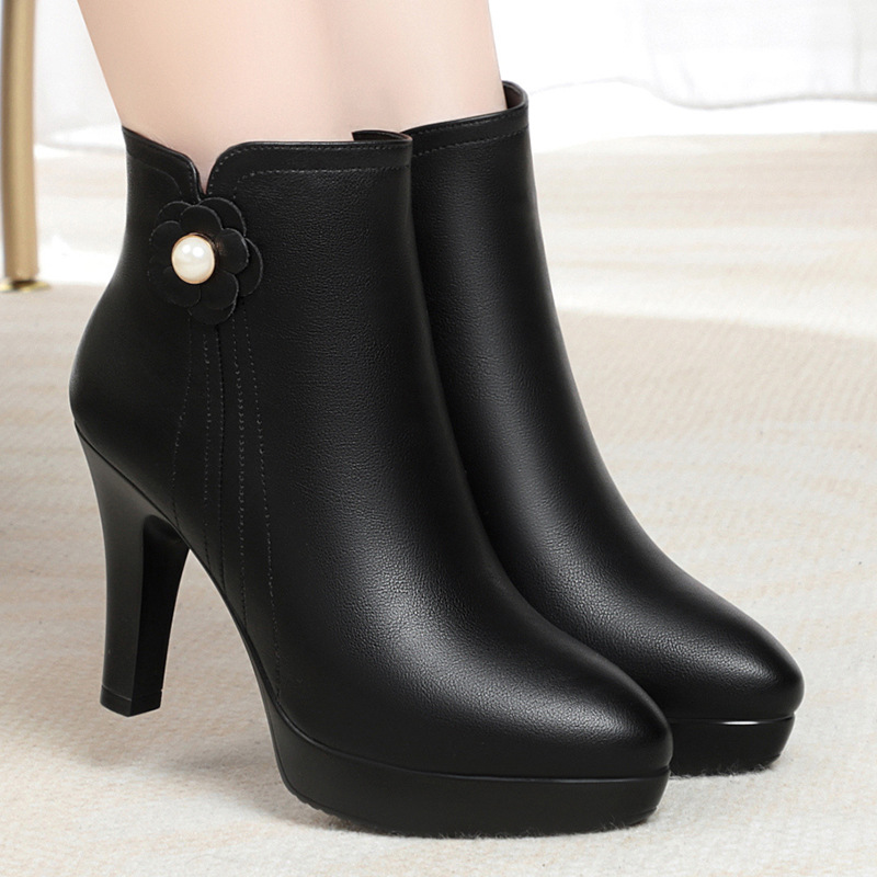 高跟鞋女秋冬2025新款细跟短靴软皮配裙子防水台中年女士加绒靴子
