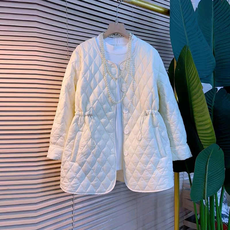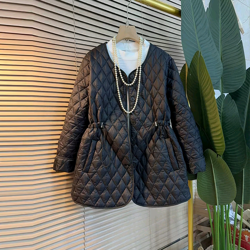 胖MM显瘦圆领收腰菱形格长袖夹棉外套加肥大码女装冬季款轻薄棉服