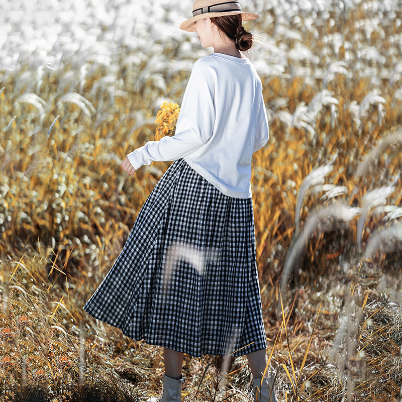 现货【扶闲】纯棉格子半身裙女长裙2025春季百搭围巾自然腰A字裙