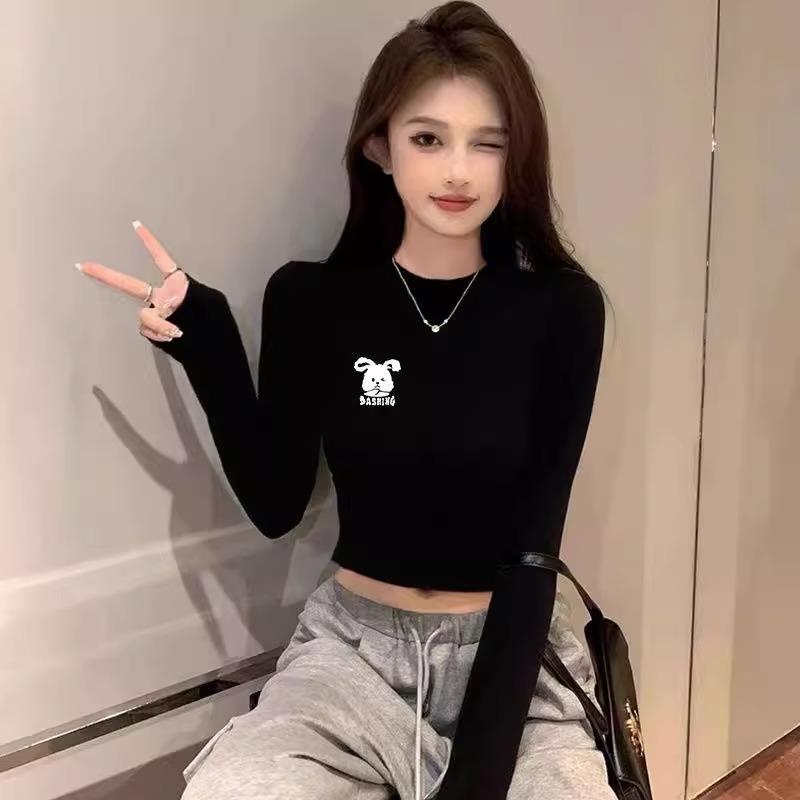 黑色短款长袖t恤女春季2025新款纯棉修身紧身内搭高级打底衫上衣