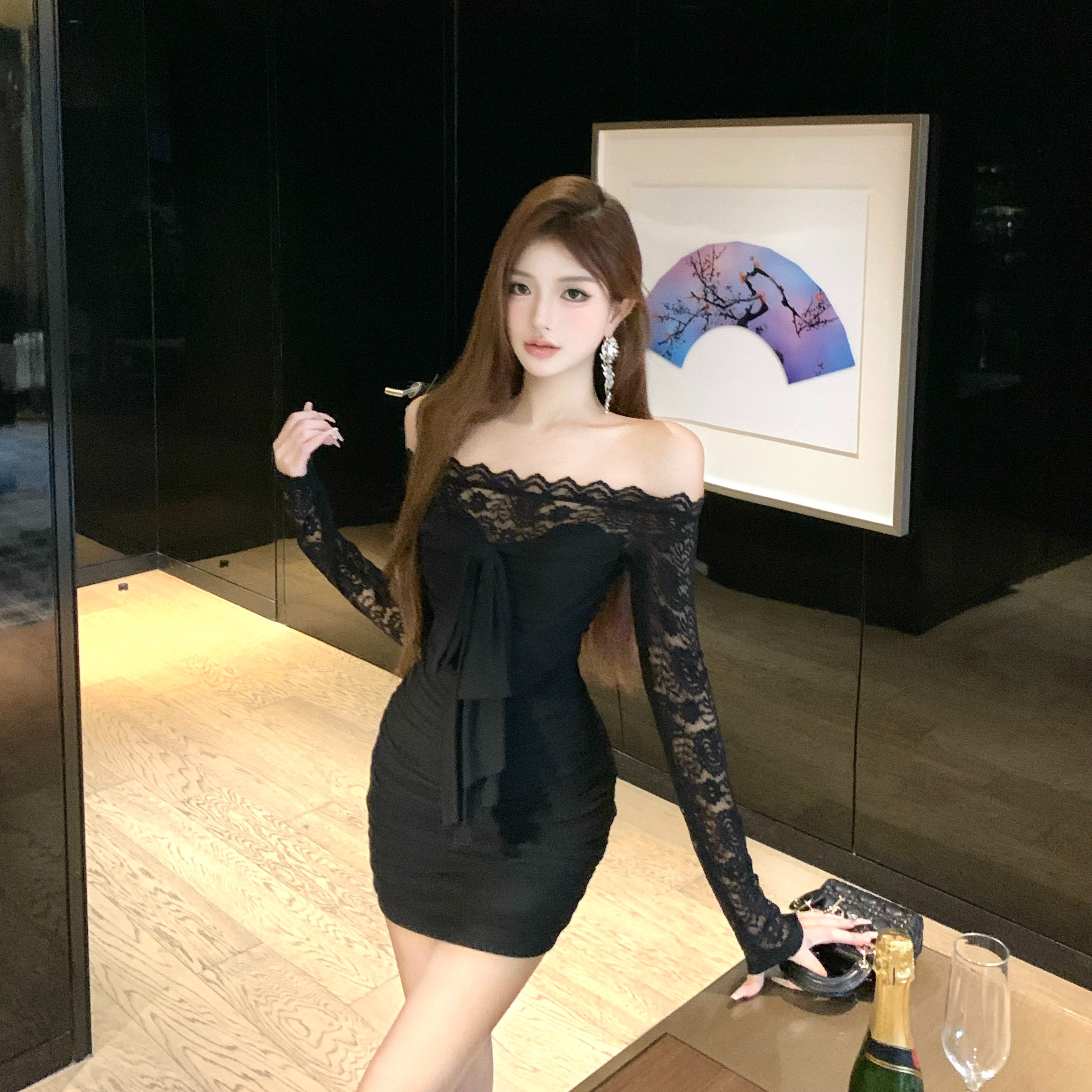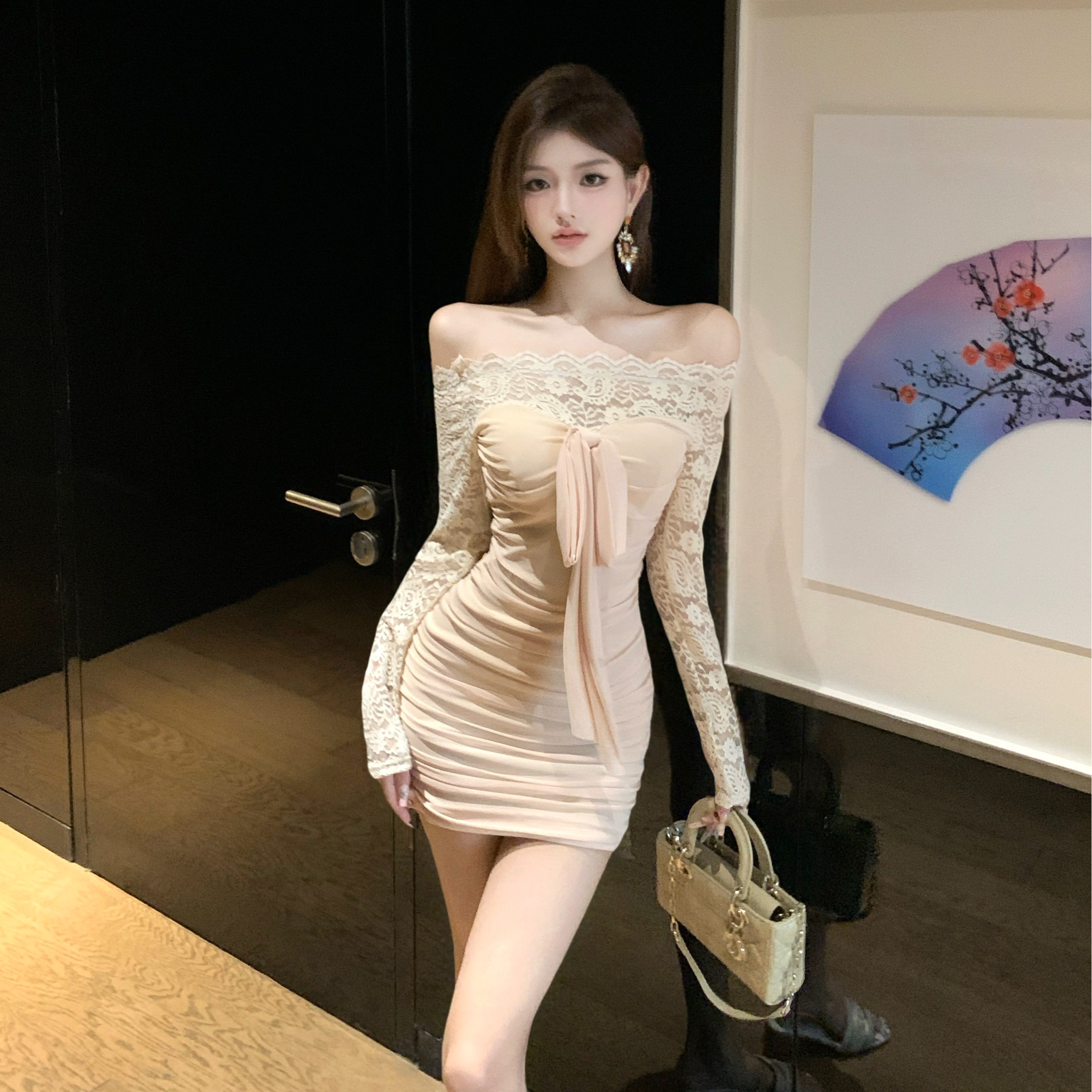 实拍一字肩绑带长袖打底连衣裙蕾丝拼接收腰裙纯欲风修身包臀短裙
