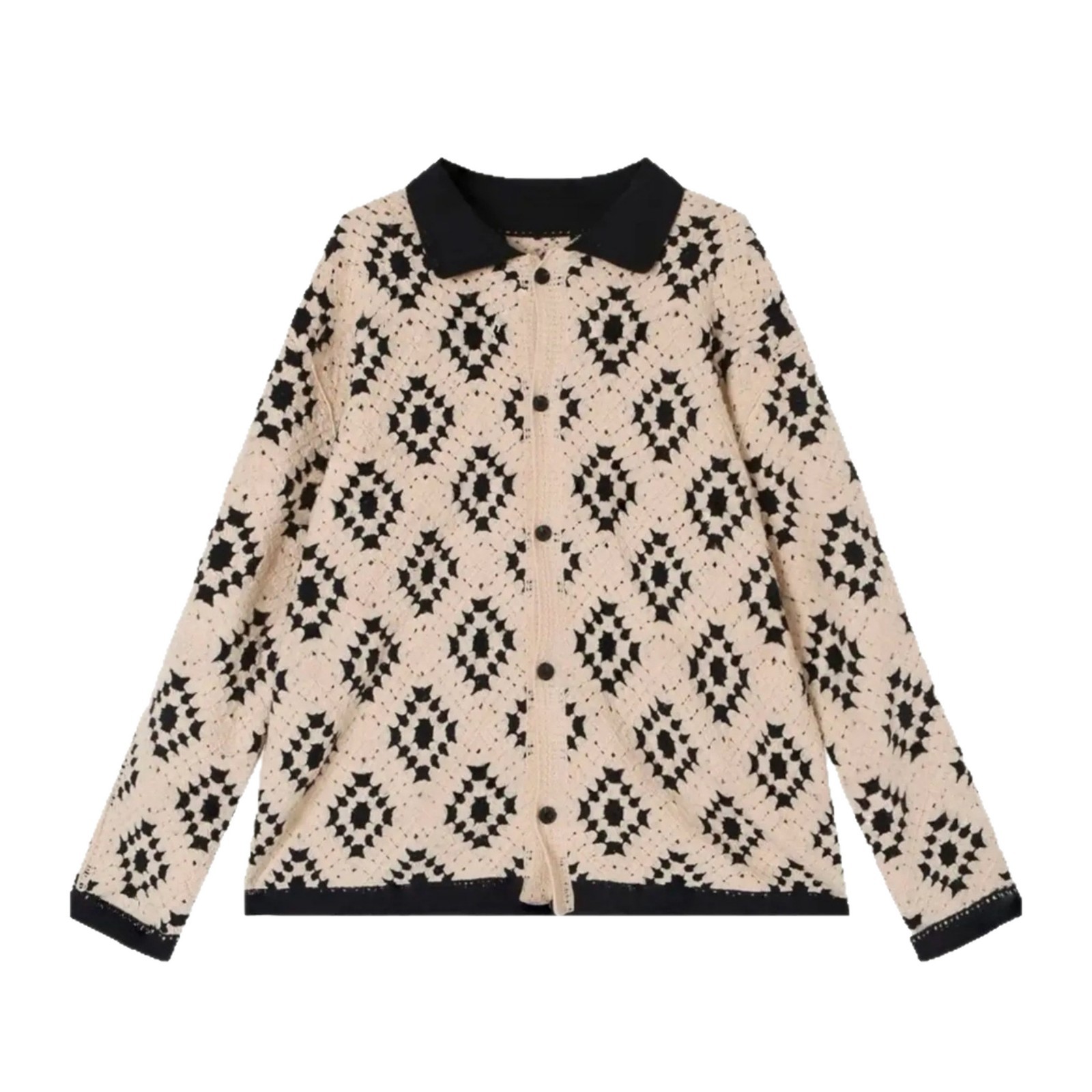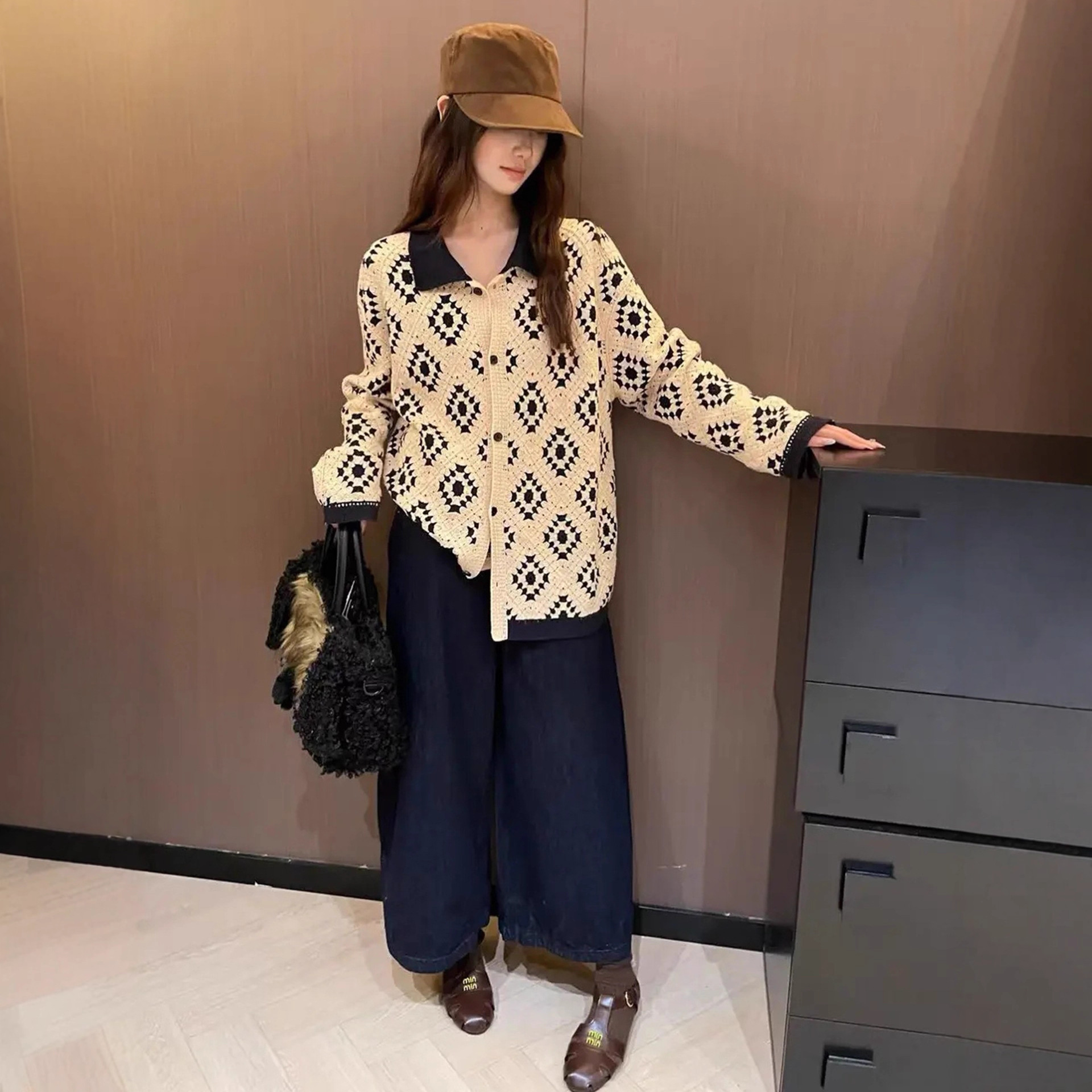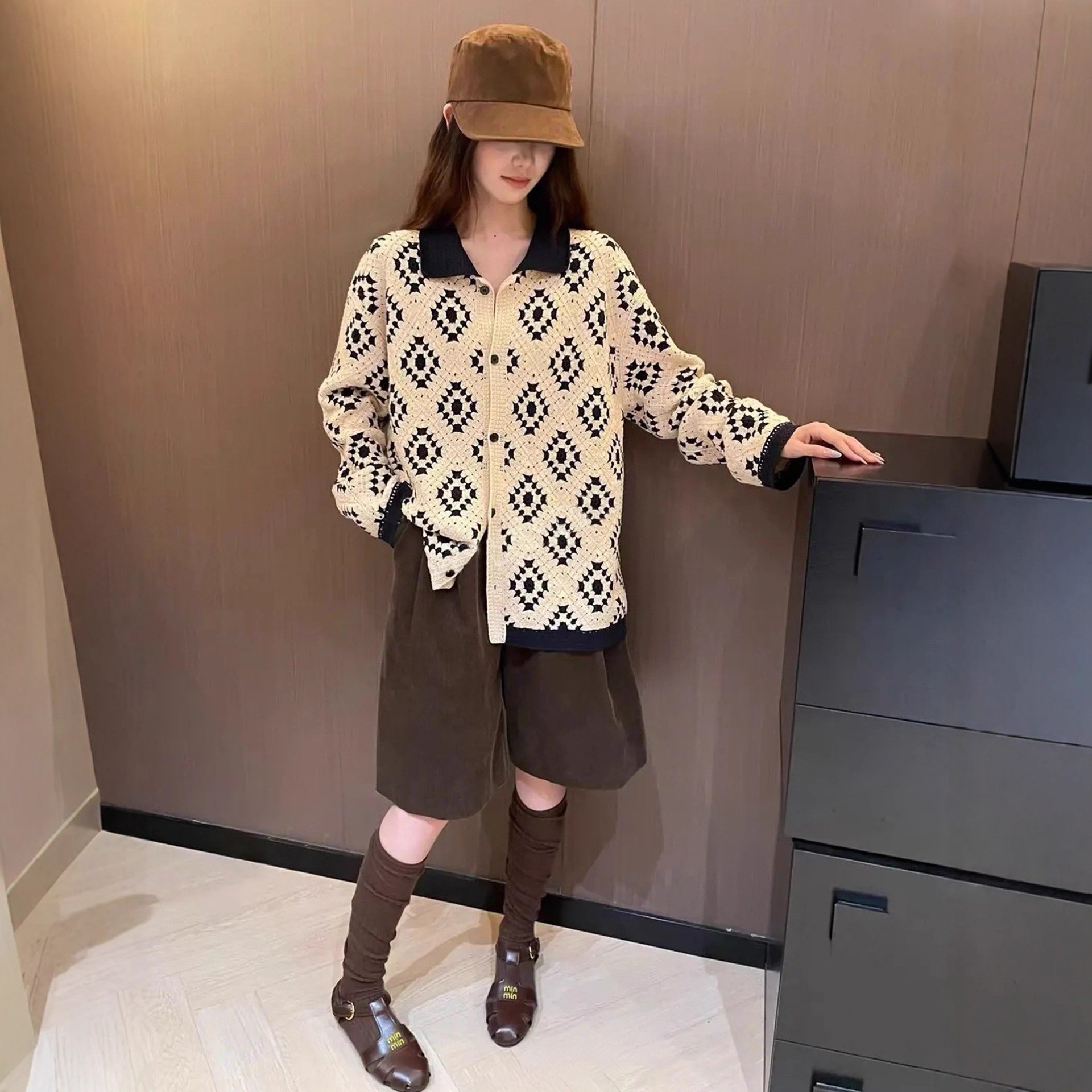 2025春秋新款小香风宽松棉线钩花菱格镂空毛衣开衫女士针织衫外套
