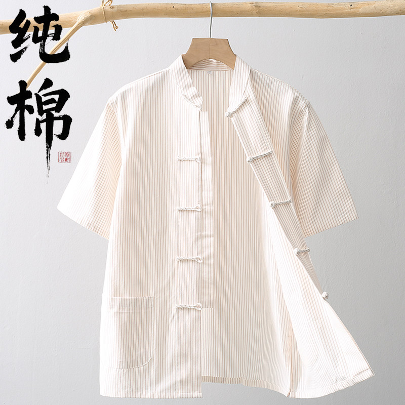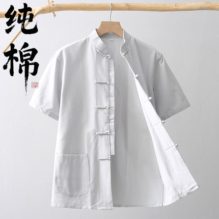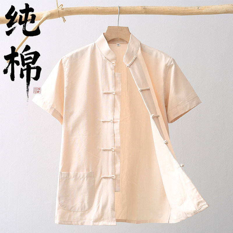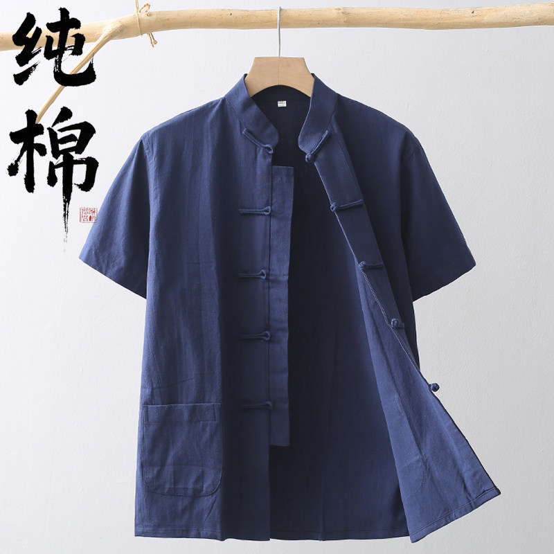 夏季唐装男纯棉短袖中老年中国风中式复古风男装粗布汉服半袖衬衫