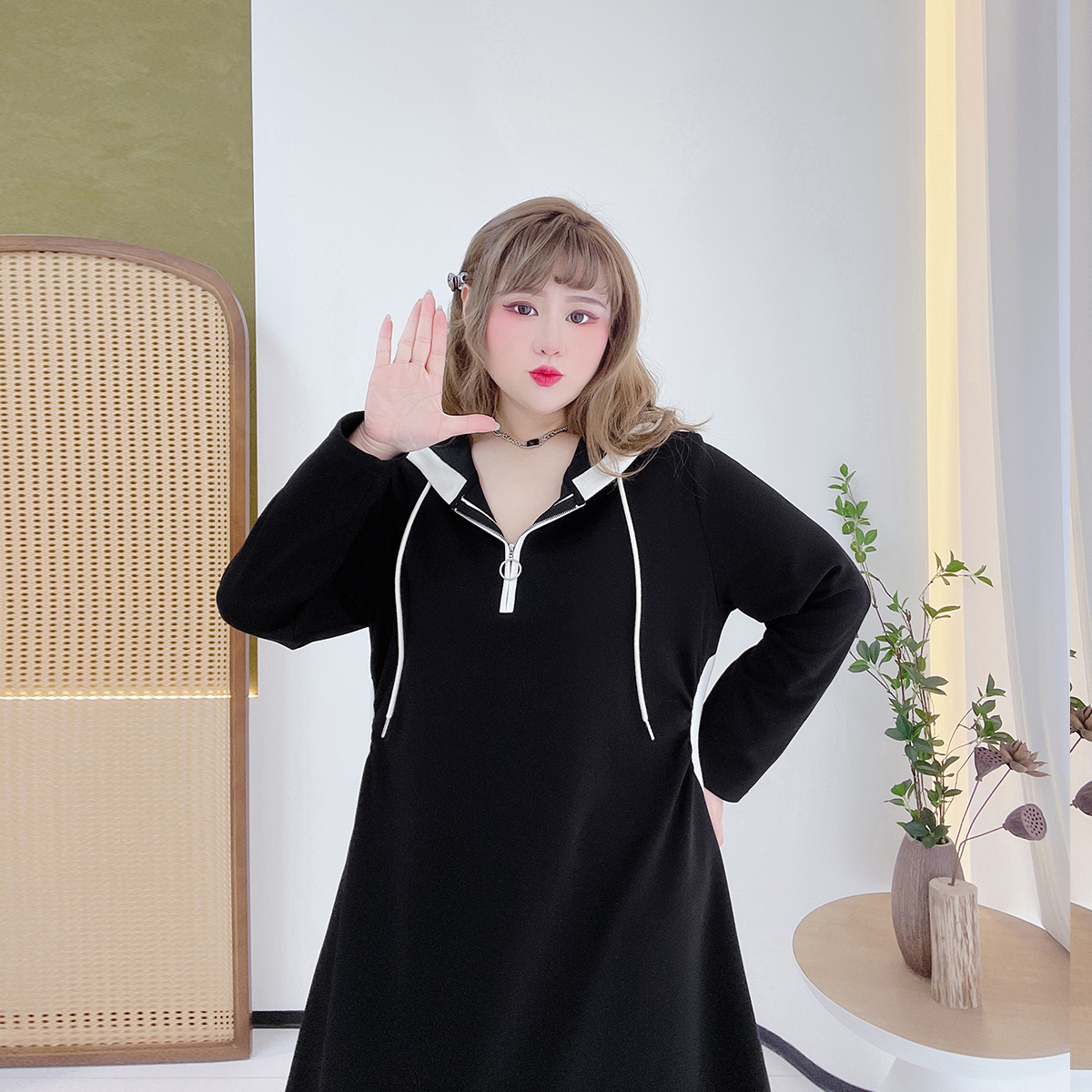 260斤修容连衣裙胖仙女莹莹大码女装胖mm撞色收腰显瘦连帽长裙子