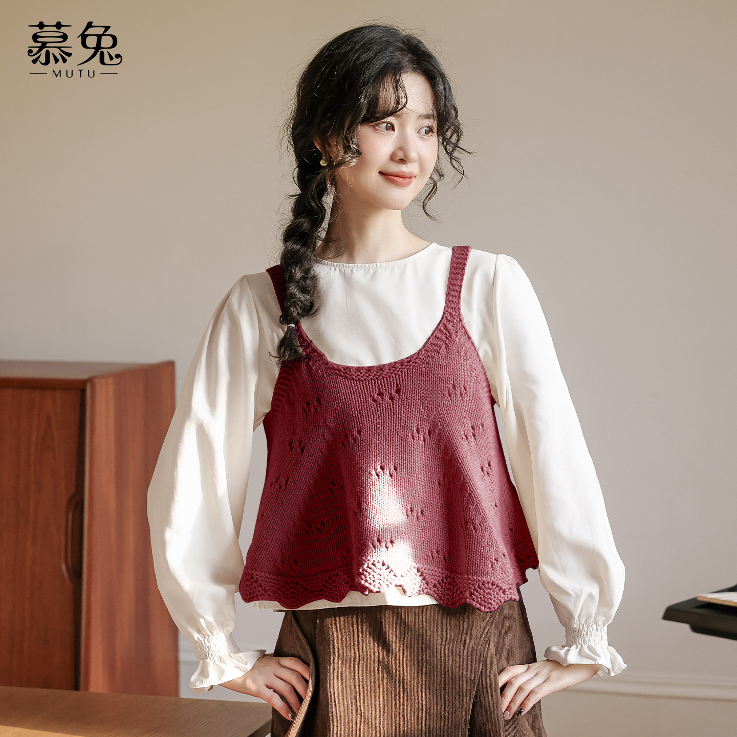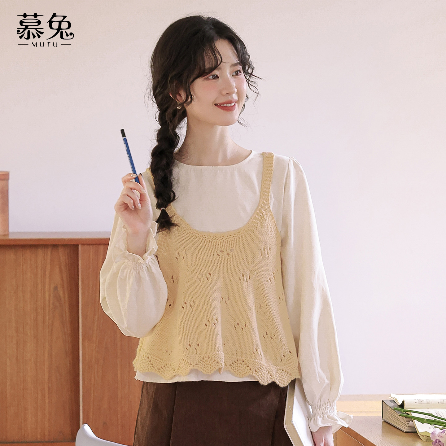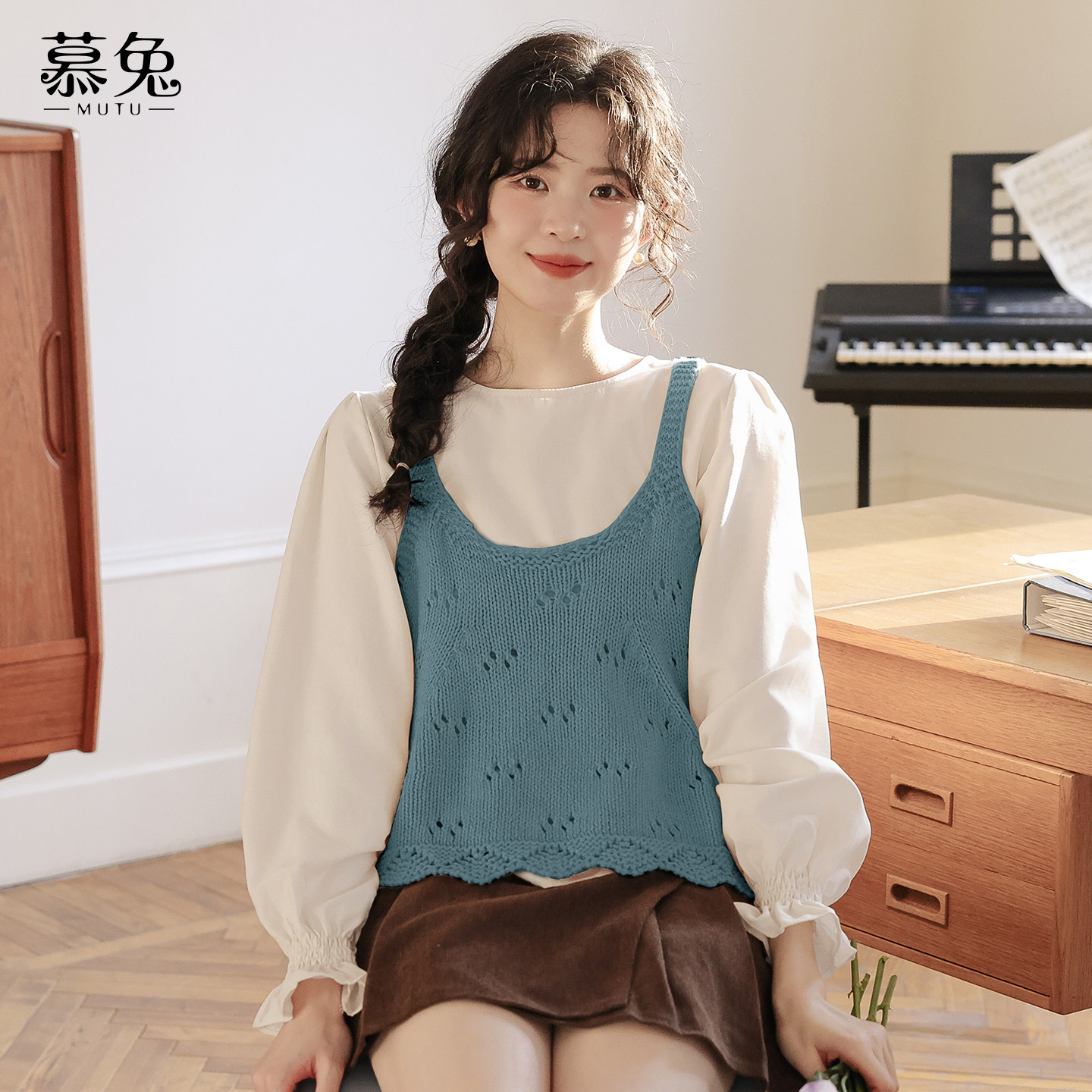 慕兔针织吊带背心叠穿长袖衬衫两件套女2025秋季新款甜美俏皮套装