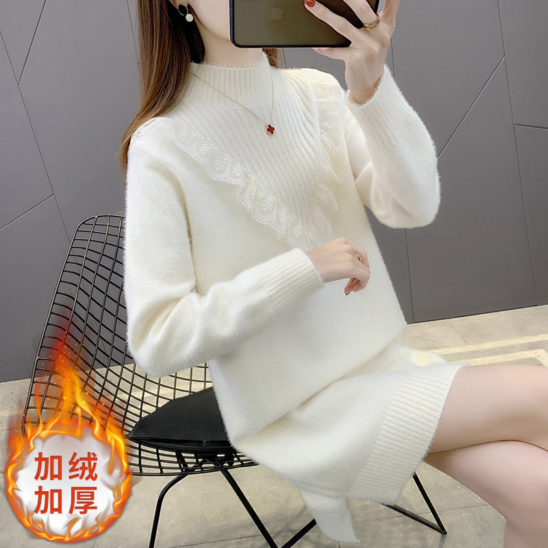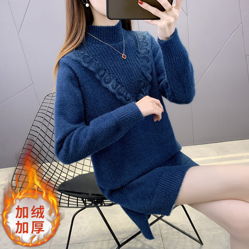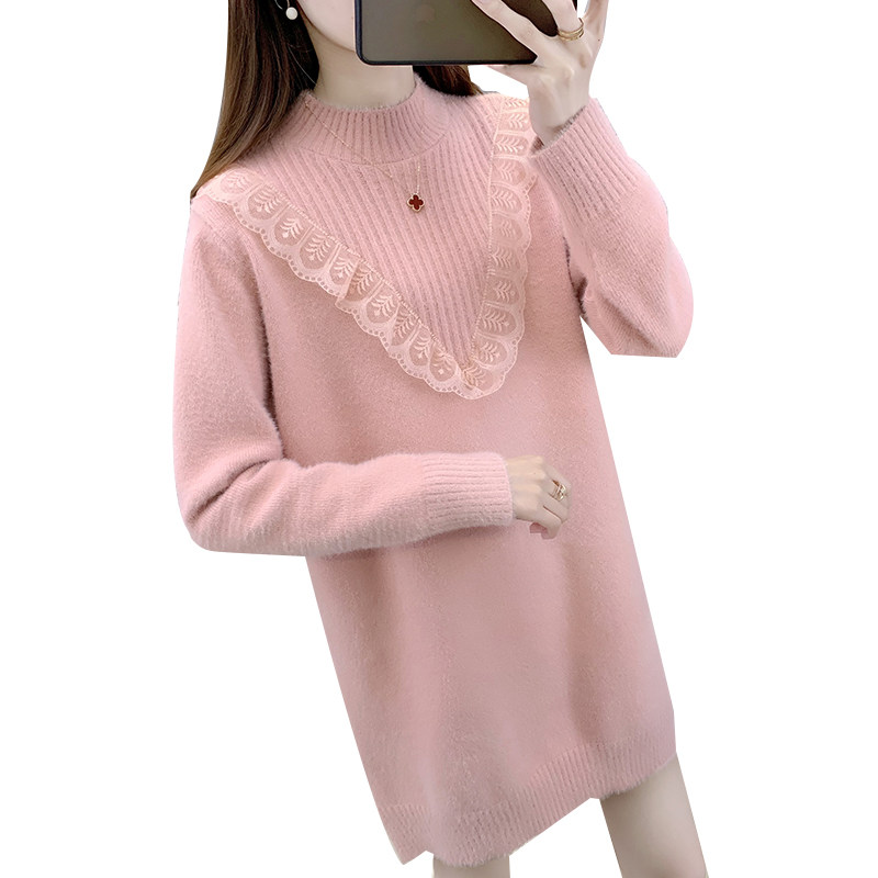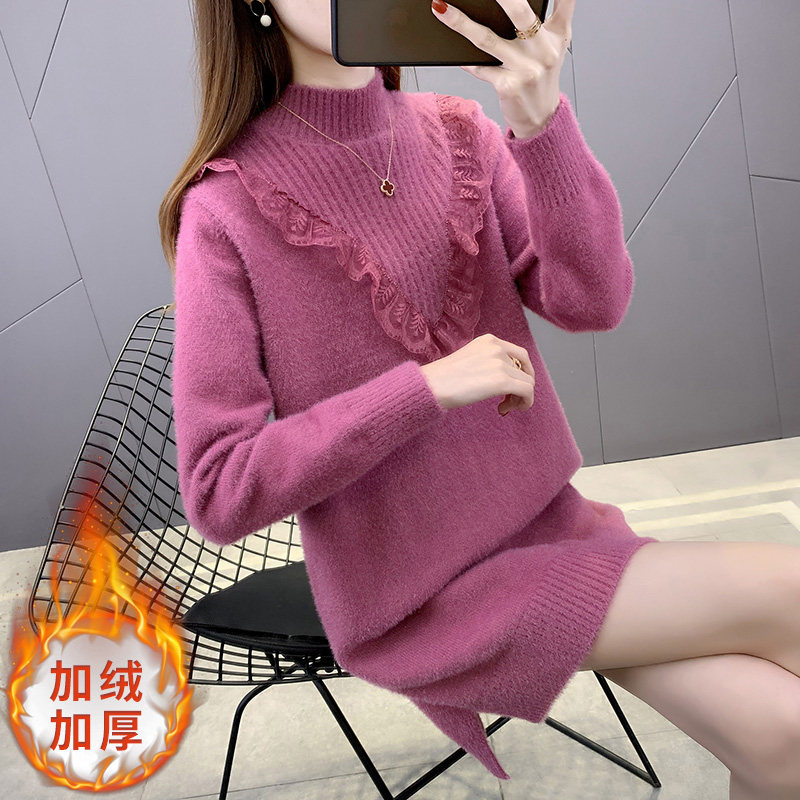 半高领蕾丝水貂绒毛衣女秋冬中长款加厚2025新款遮屁股加绒打底衫