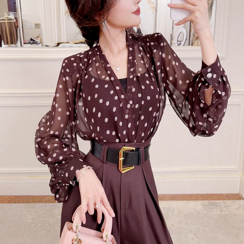 飞姐定制复古波点雪纺衫上衣女轻薄款夏季长袖防晒衬衣V领