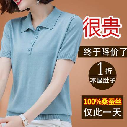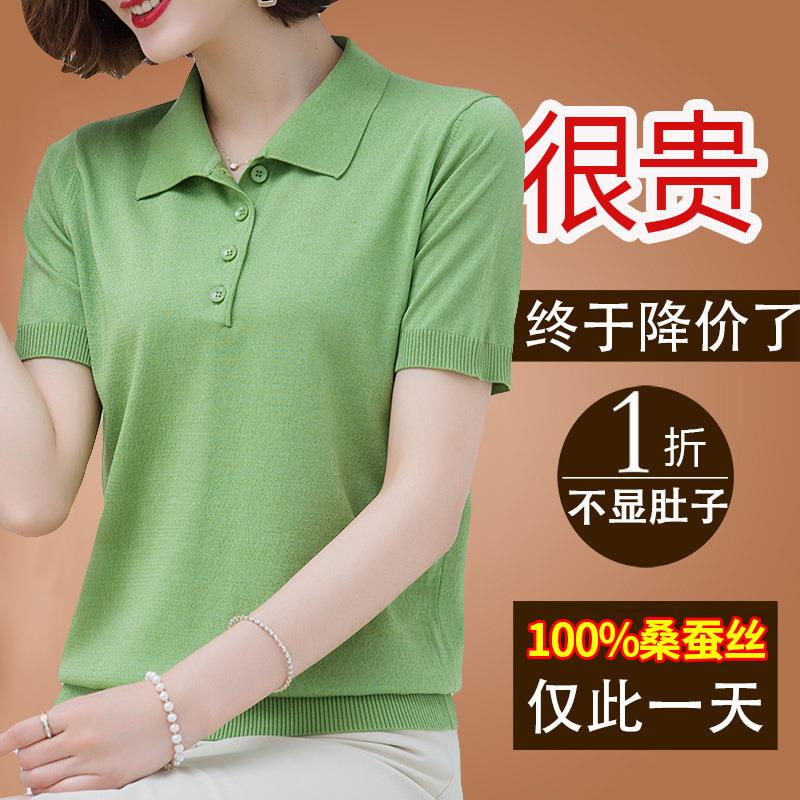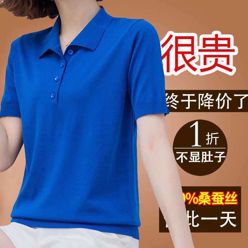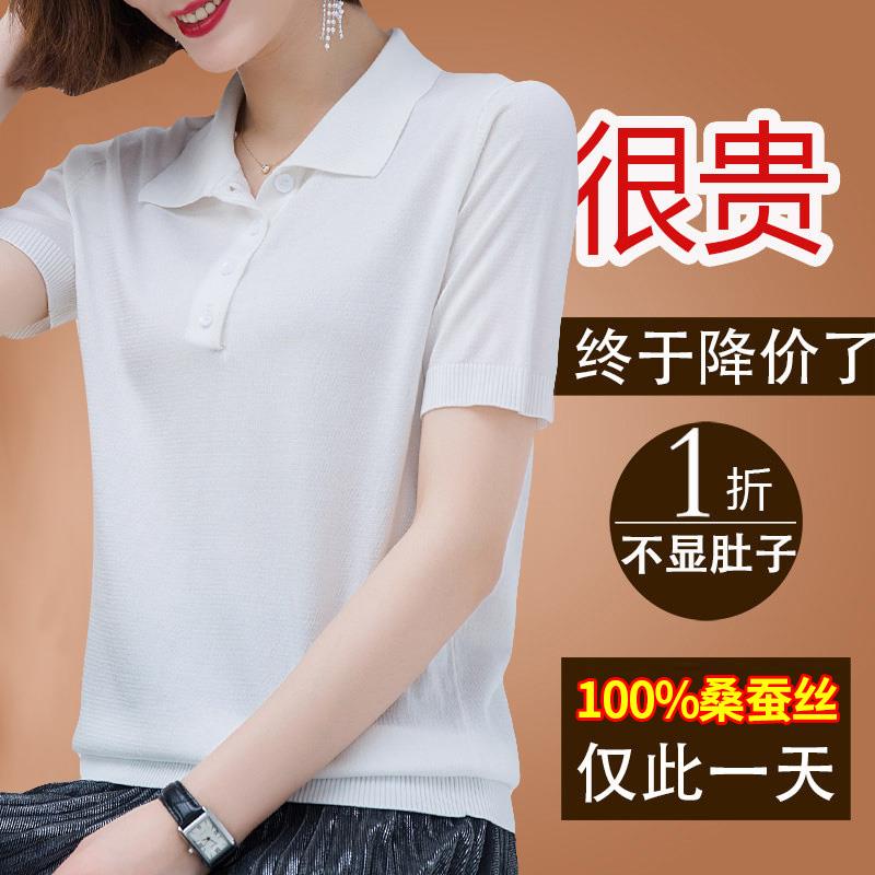 夏装新款真丝t恤女2021年新款polo领冰丝针织短袖小衫桑蚕丝上衣