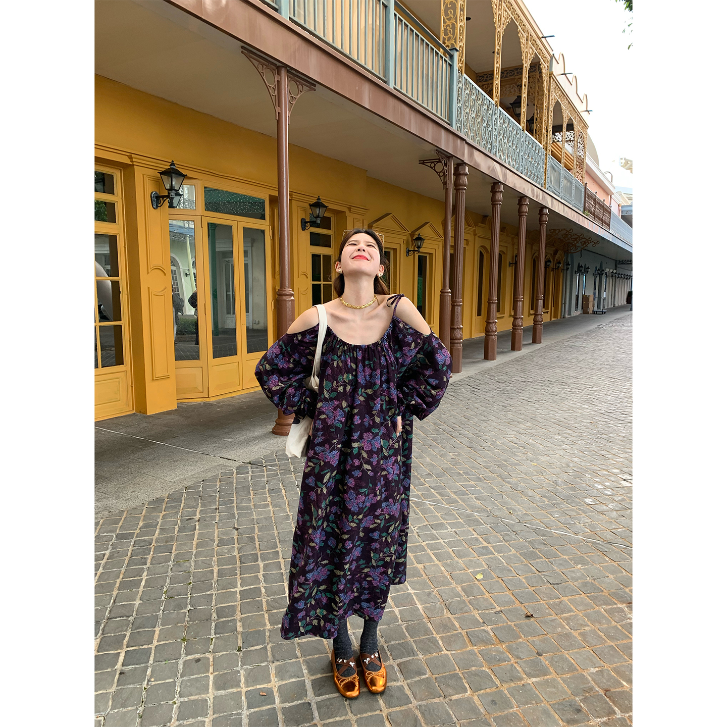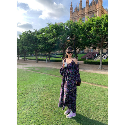 落落狷介巨好看的早秋连衣裙紫色碎花长袖宽松裙子2025新款小个子