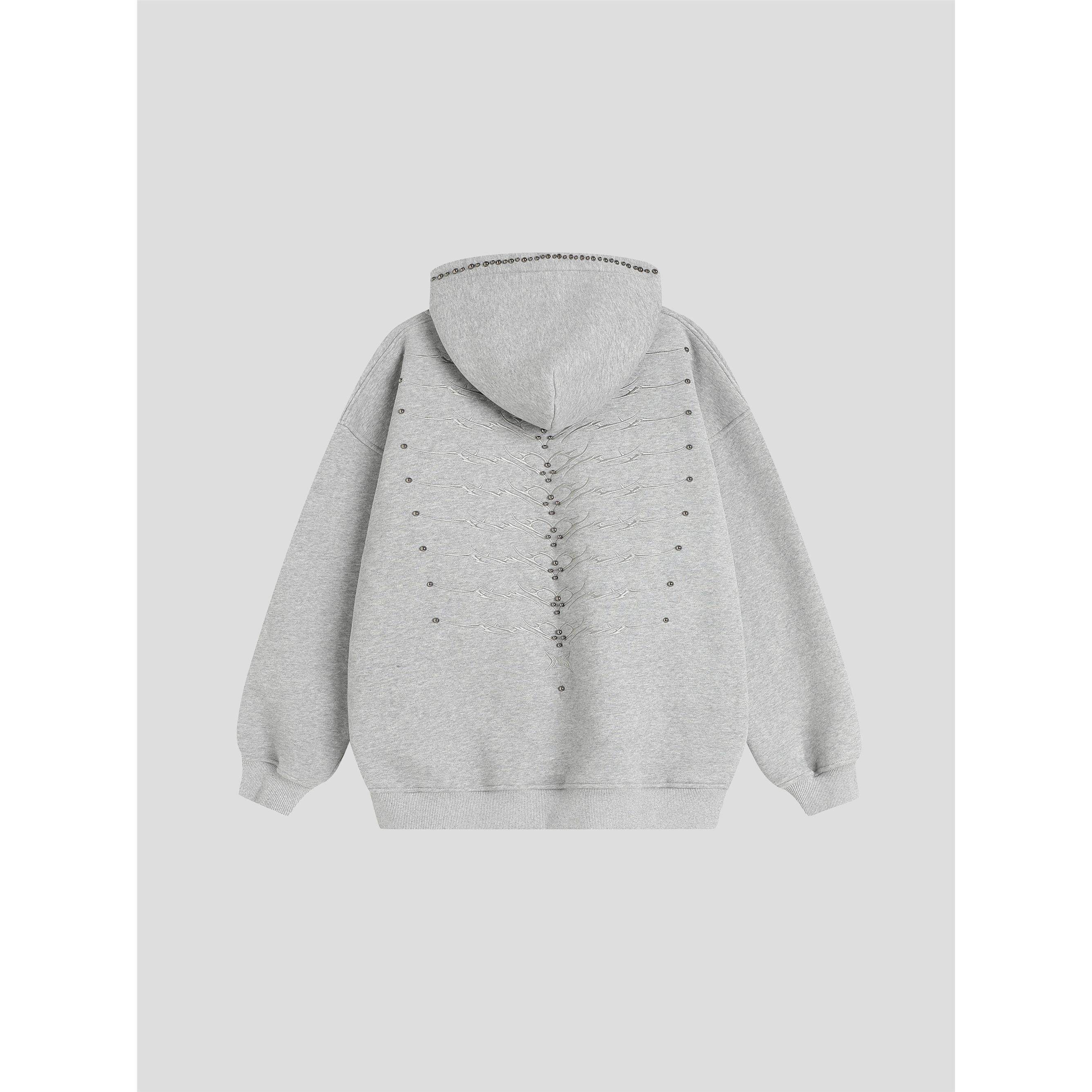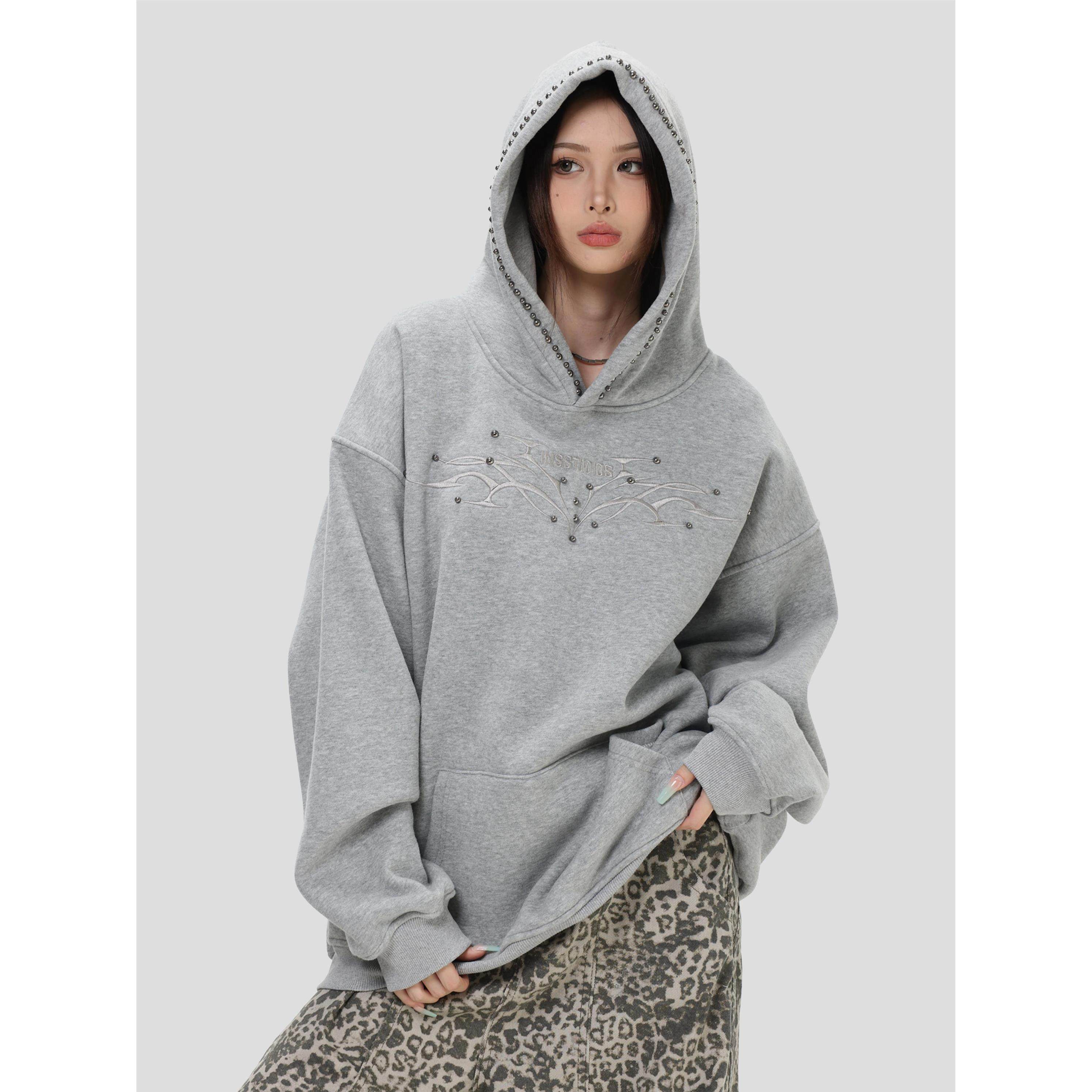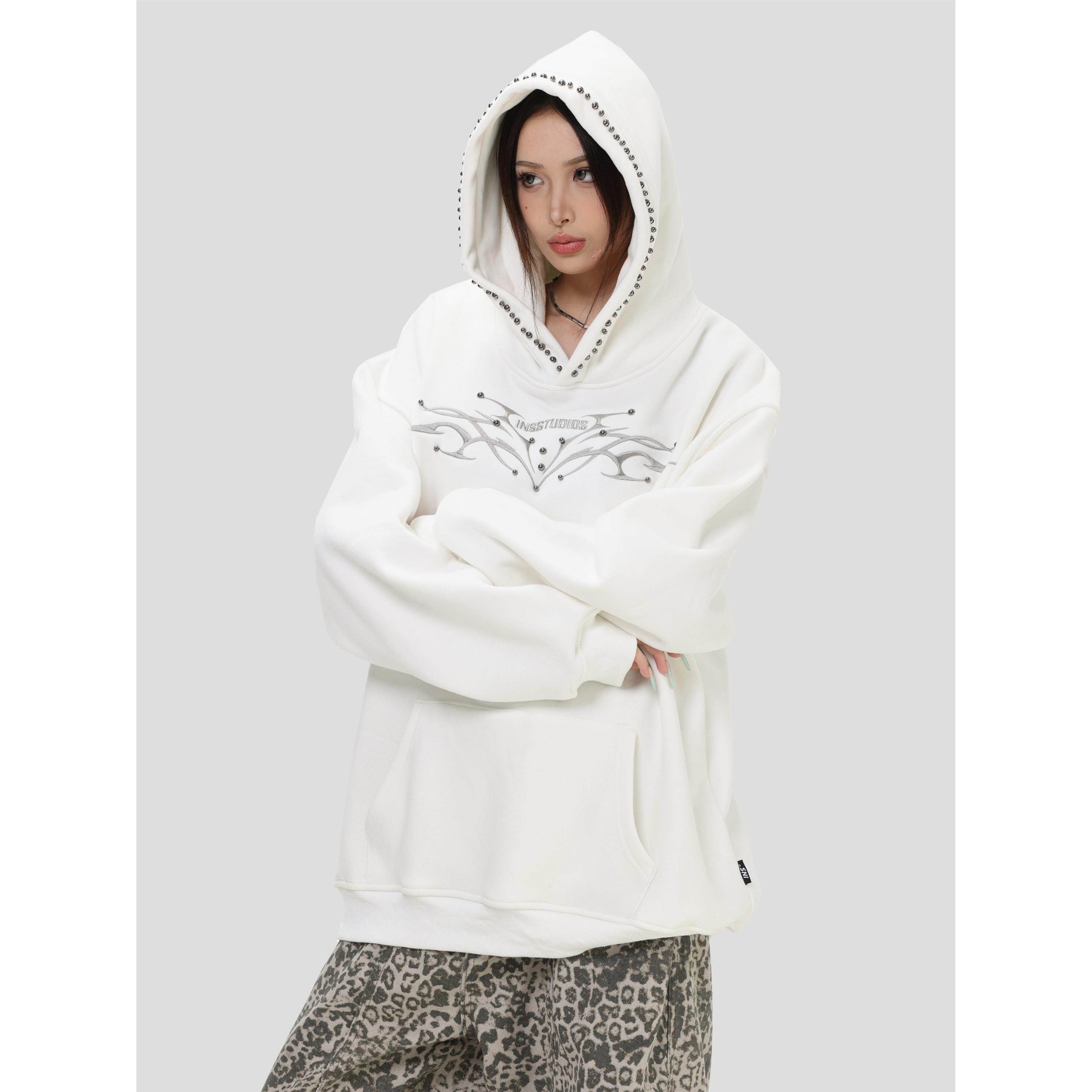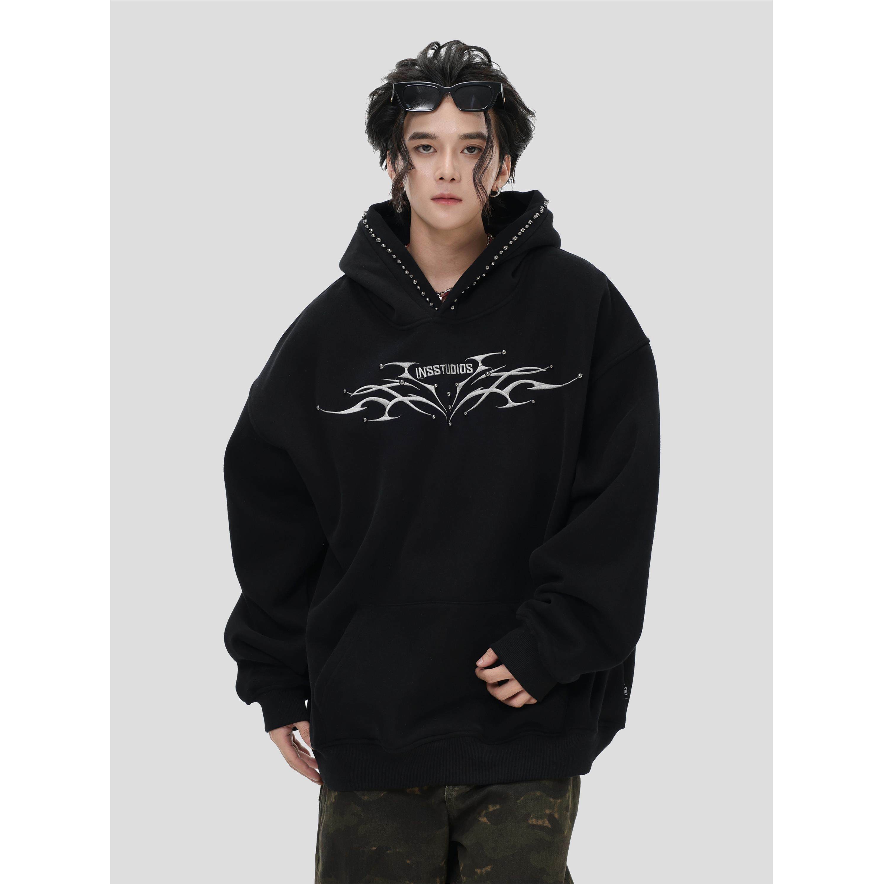 INSstudios 国潮情侣美式「铆钉脊骨刺绣连帽卫衣」宽松加绒帽衫