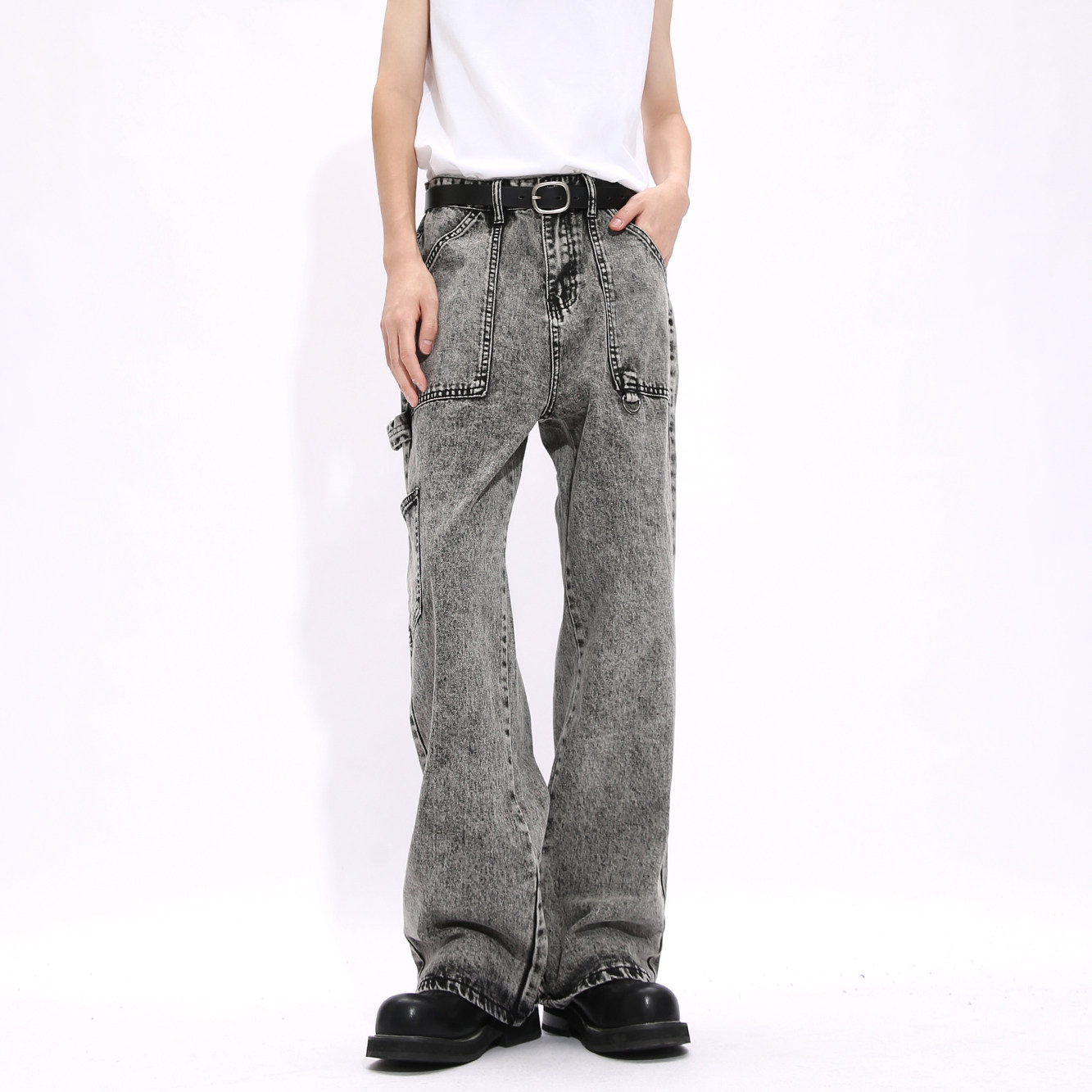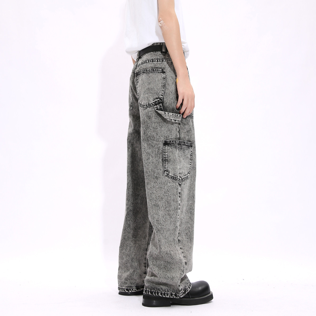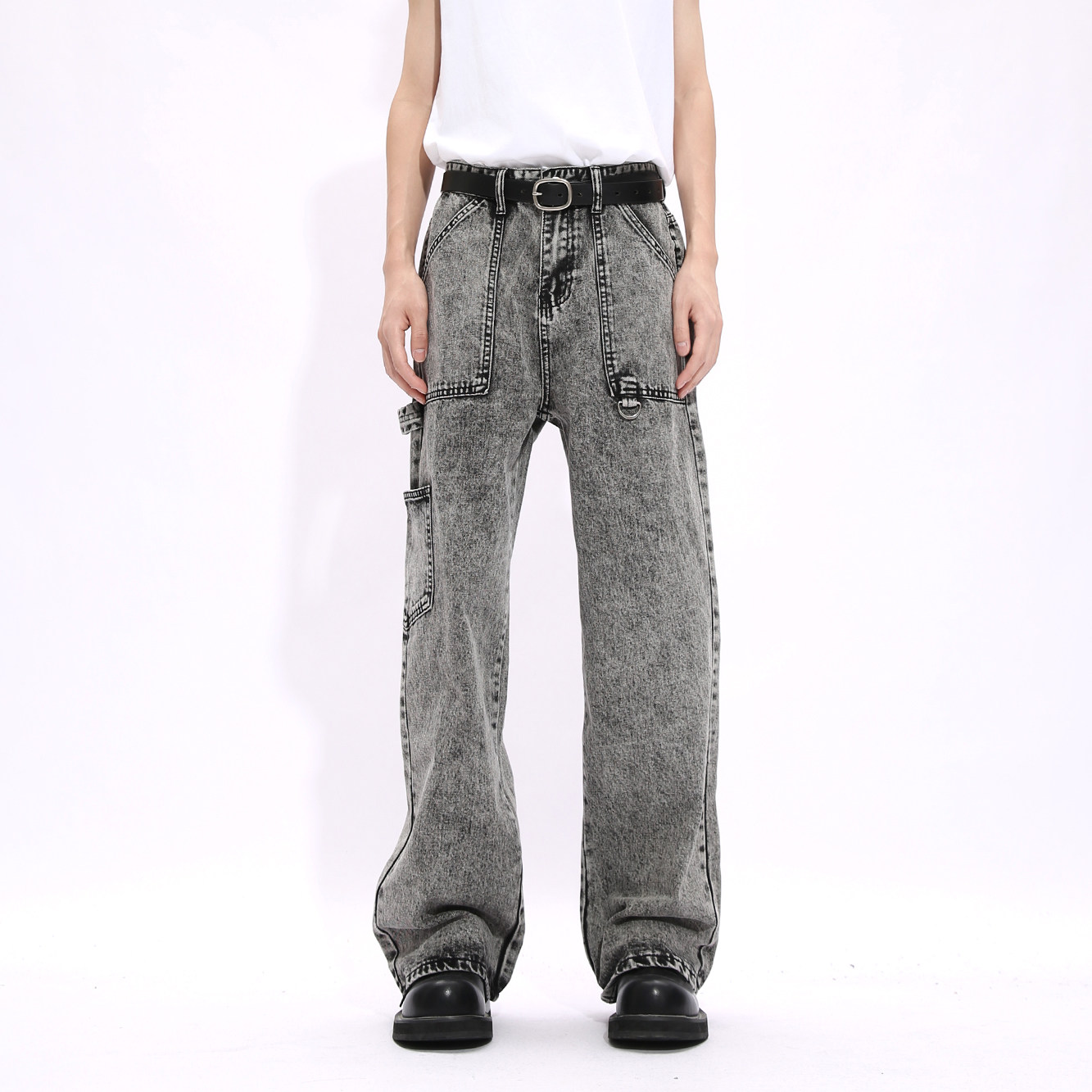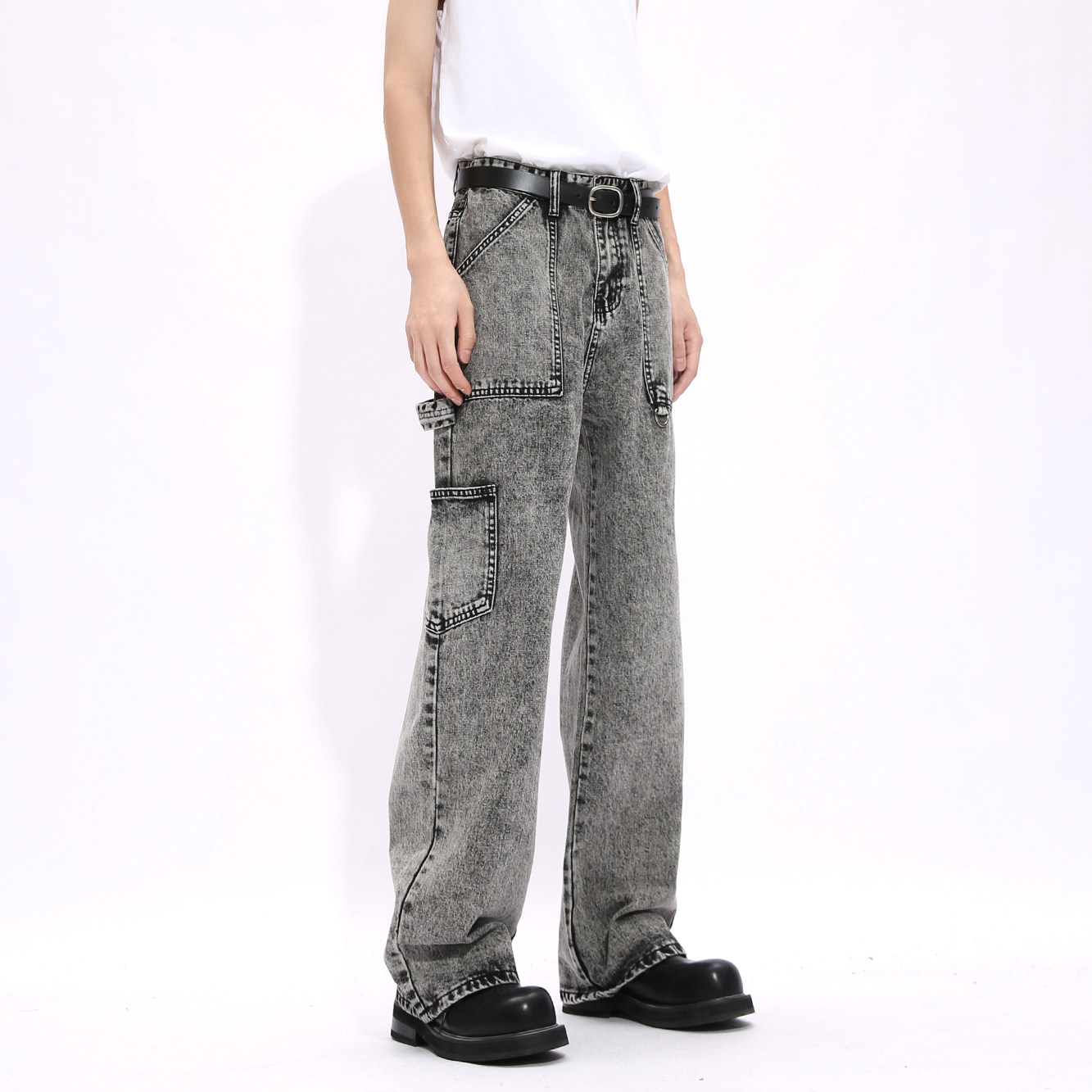 Voguo Relay 复古水洗黑灰工装牛仔裤男女同款中腰雪花牛仔直筒裤
