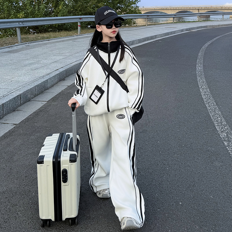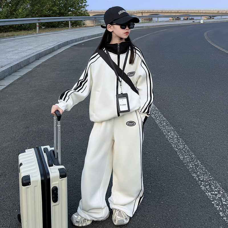 女童2025冬季新款中大童酷飒风休闲宽松大版一体绒运动服两件套装