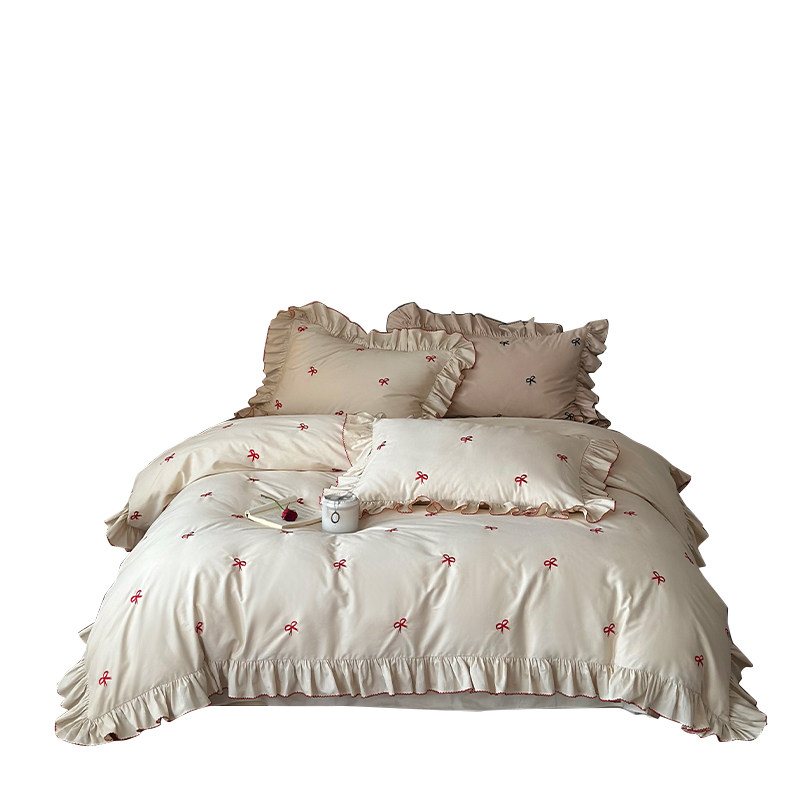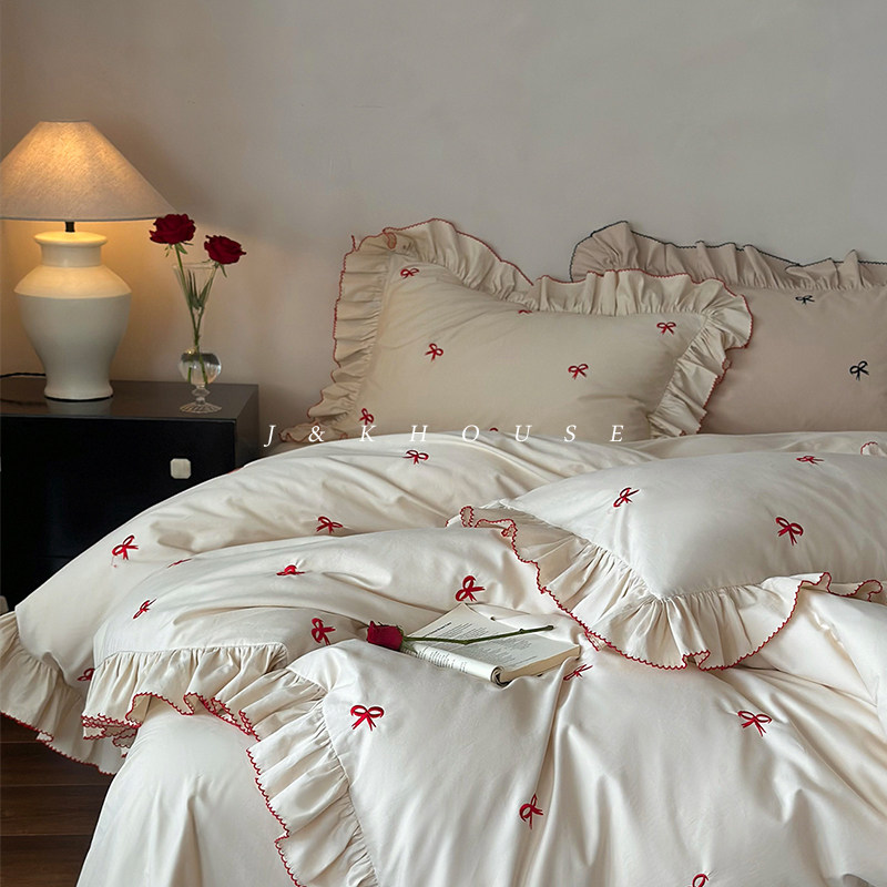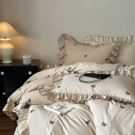 Girlish|法式秋冬磨毛纯棉四件套少女蝴蝶结刺绣贡缎全棉床上用品