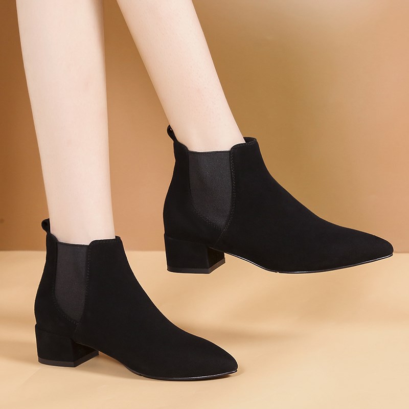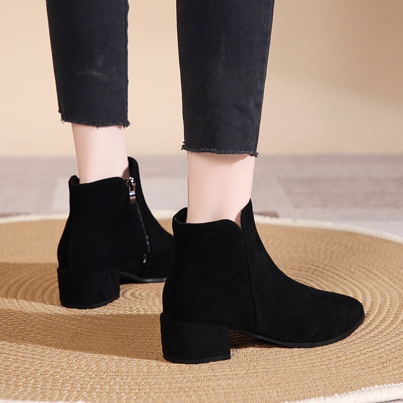 靴子女秋冬高跟磨砂女鞋黑色裸靴工作鞋中跟大Q码女靴尖头粗跟短
