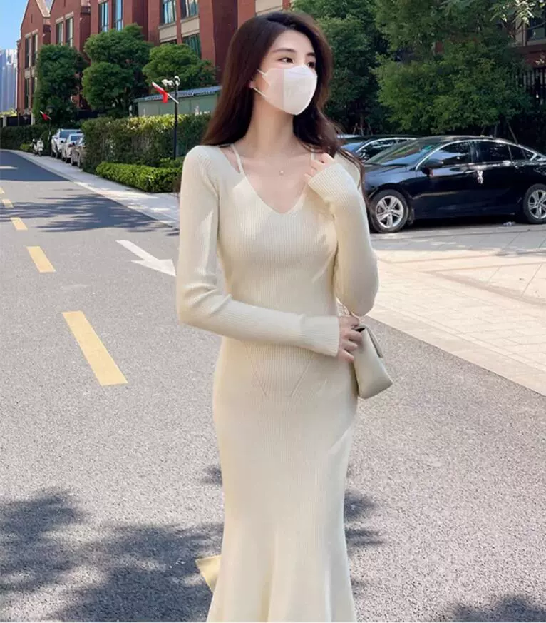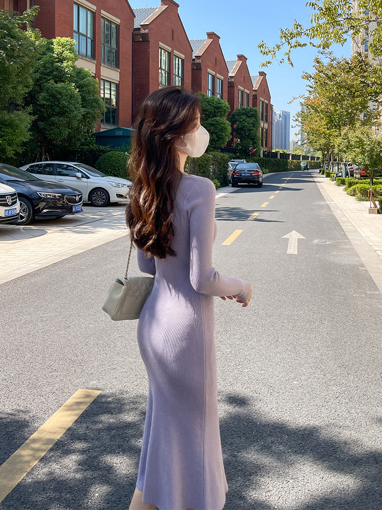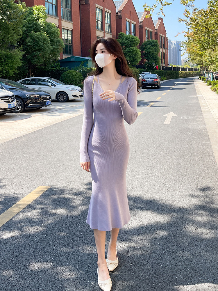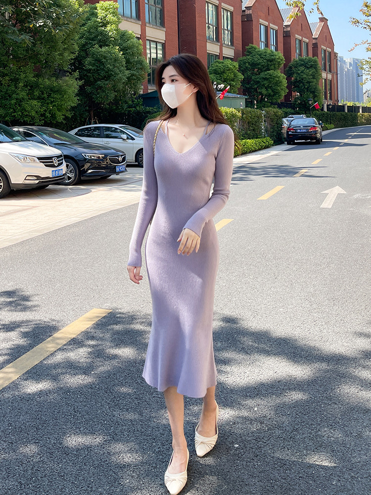 紫色v领针织连衣裙女秋冬法式收腰气质鱼尾长裙修身打底包臀裙子