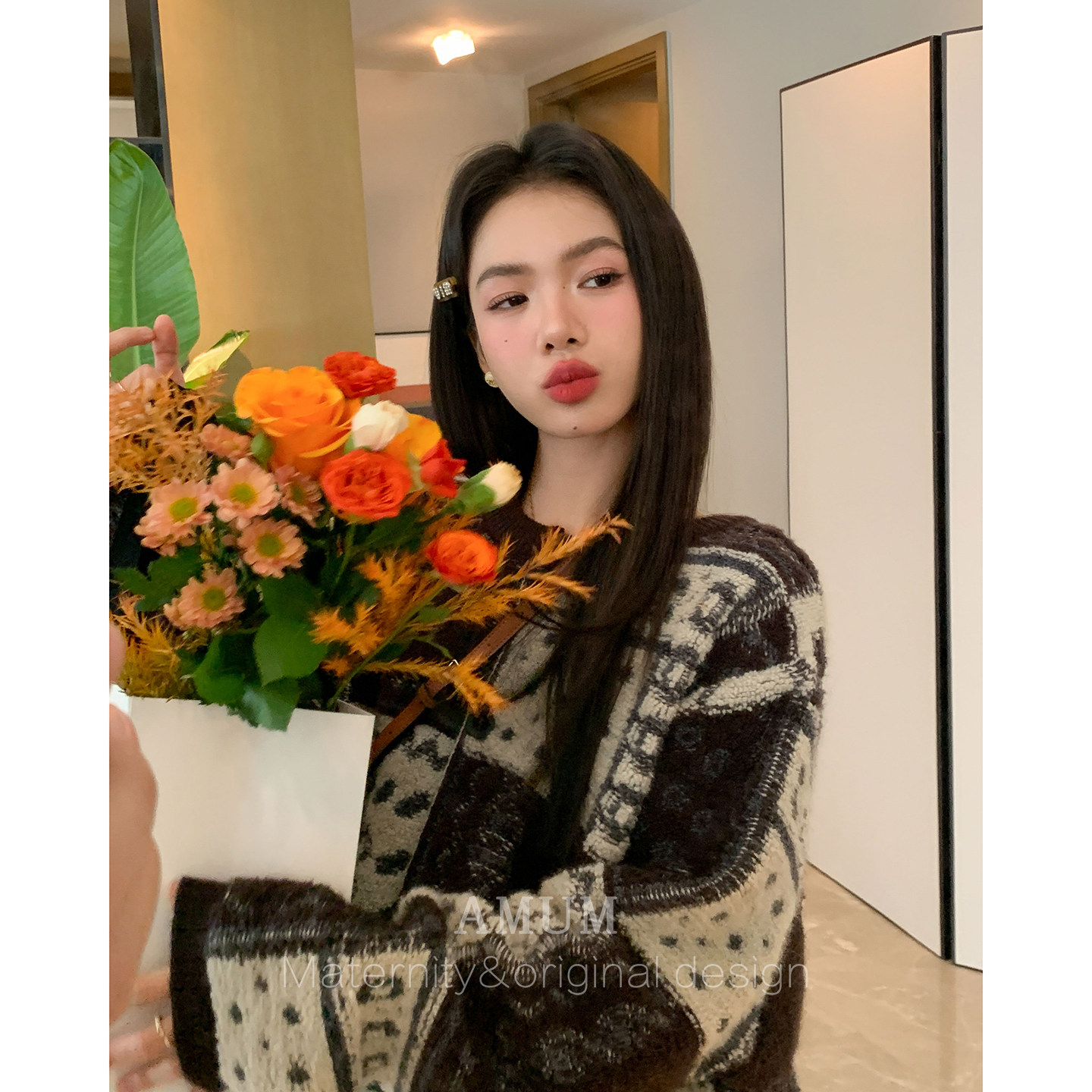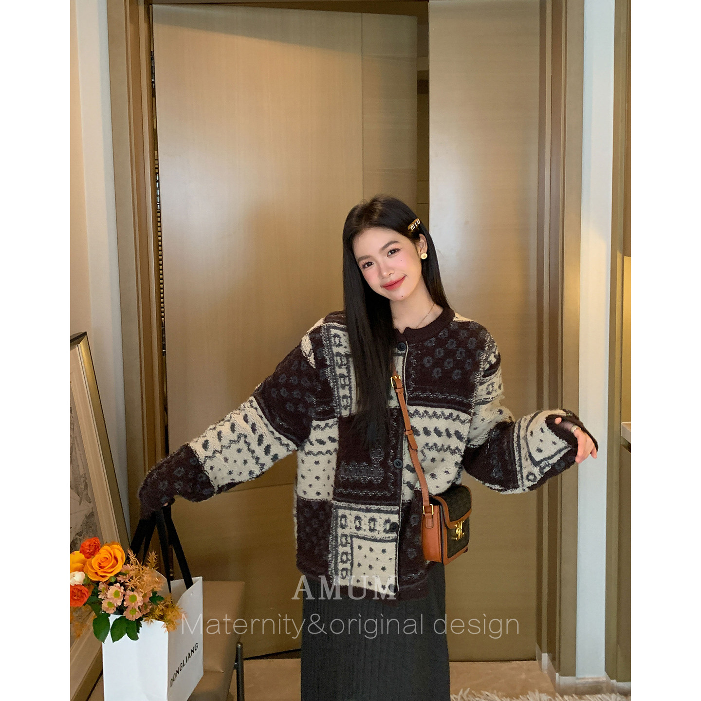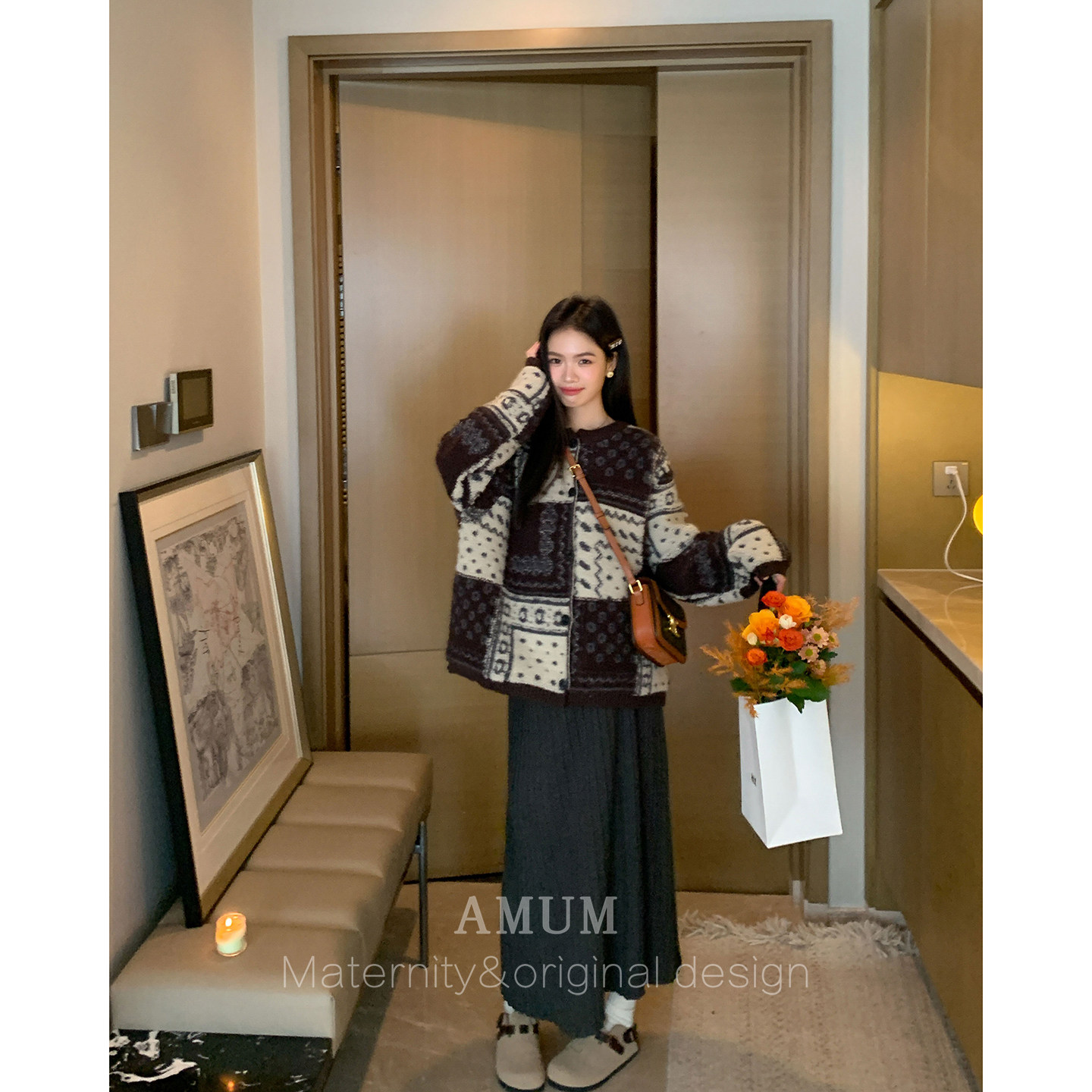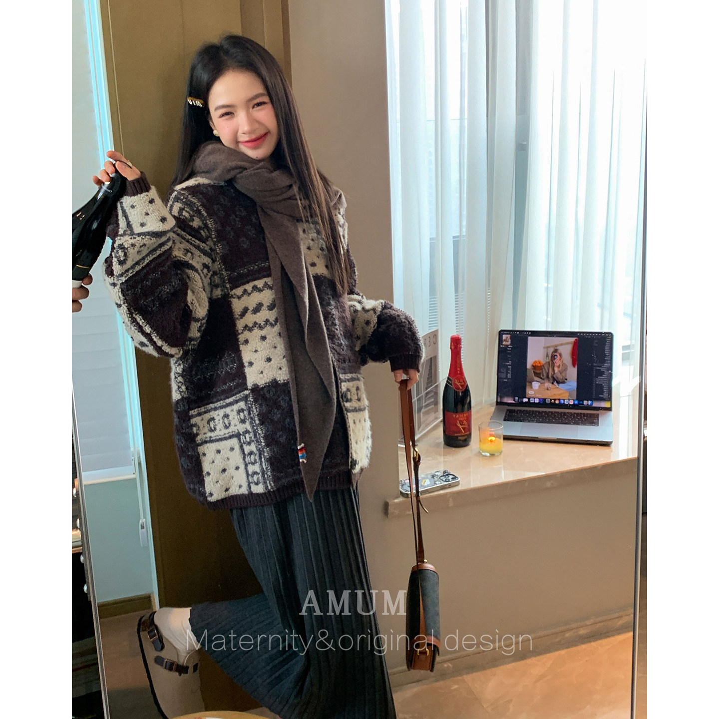 AMUM孕妇装◆无法抗拒的~古早氛围毛巾绣格子圆领毛衣外套厚开衫