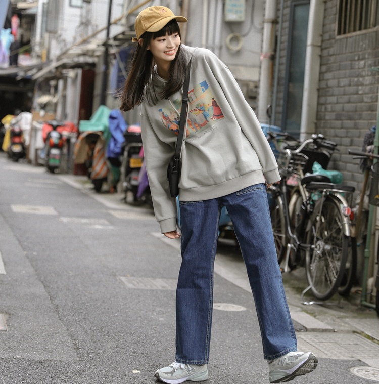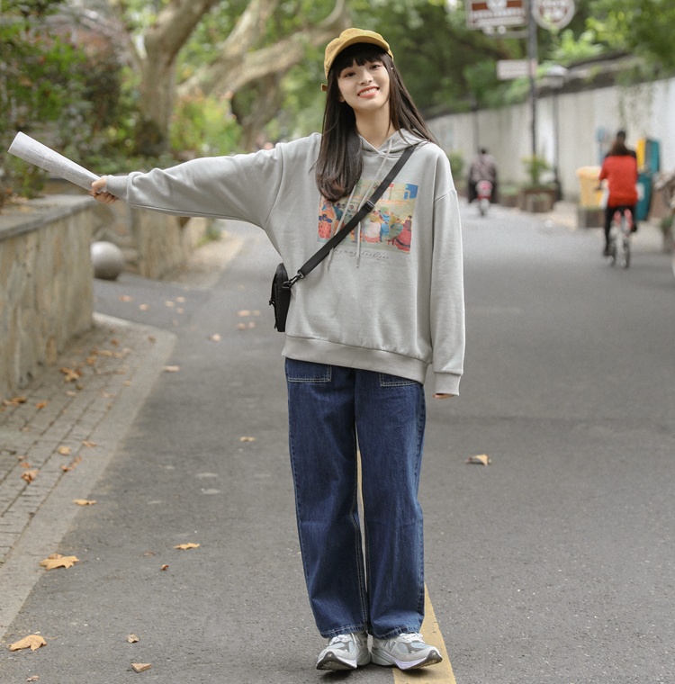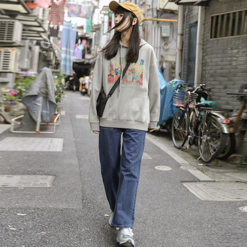 【清仓特价】春秋季时尚套装女宽松印花连帽卫衣搭牛仔裤两件套