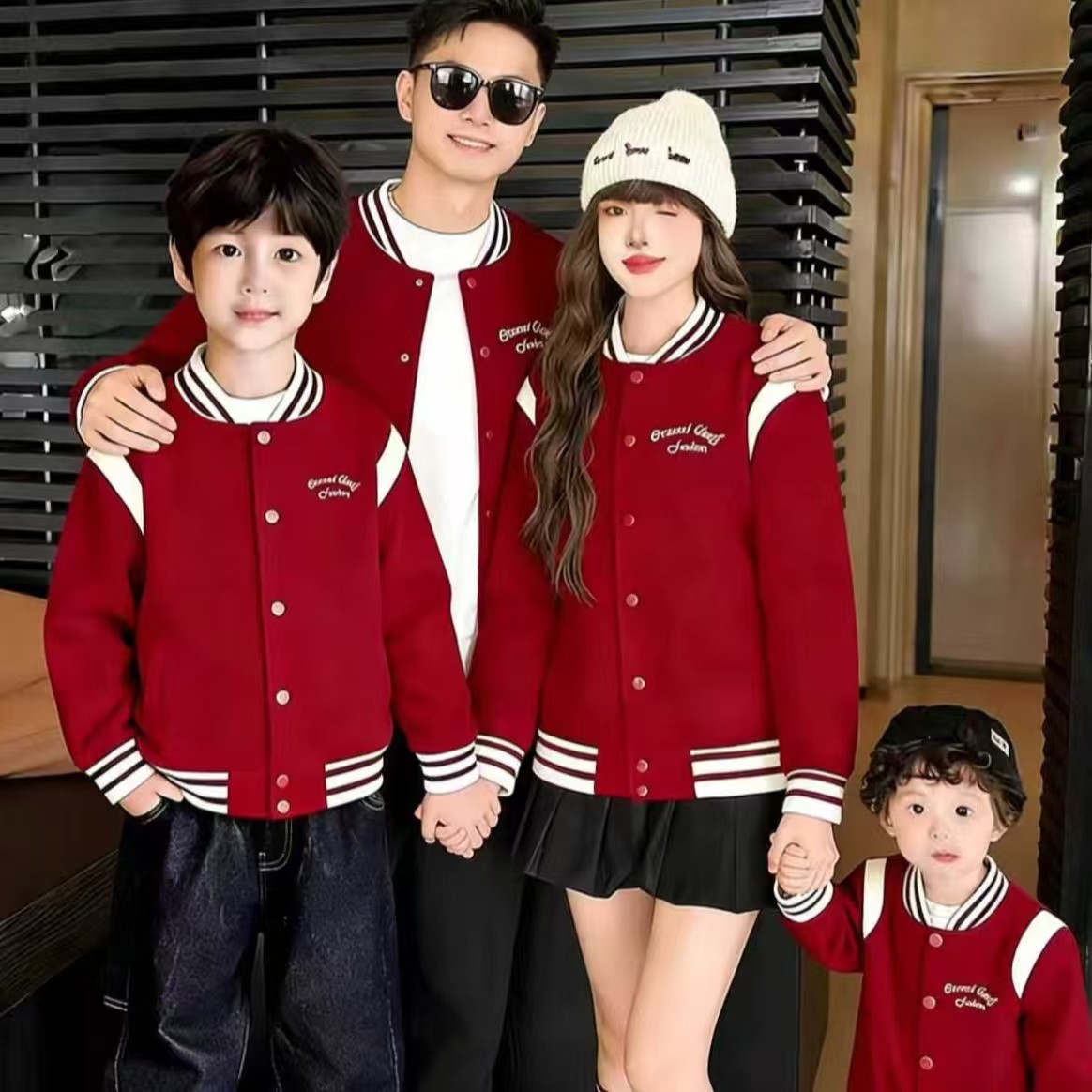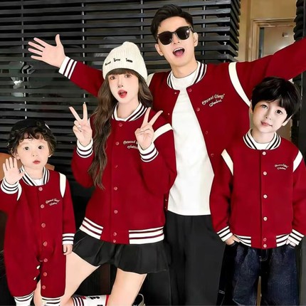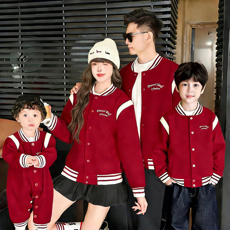 新年亲子装秋冬外套一家三口红色刺绣毛呢小月龄母女洋气时尚夹克