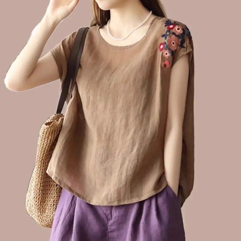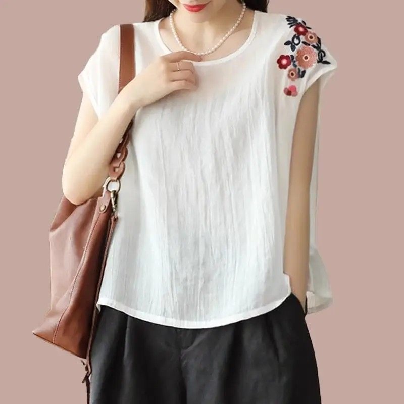民族风短袖棉麻上衣女装2025新款圆领刺绣t恤夏季薄款大码打底衫