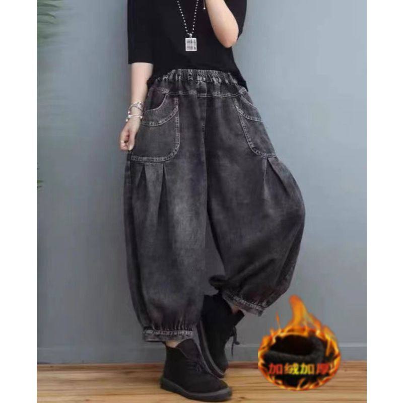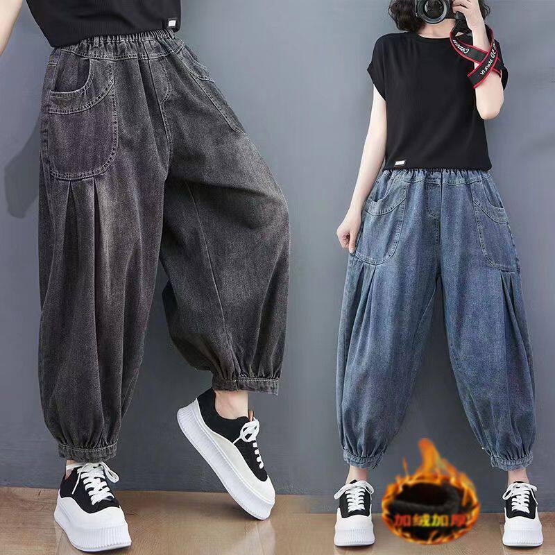 春秋新款磨白做旧牛仔哈伦裤女宽松大码松紧腰显瘦遮肉灯笼裤加厚
