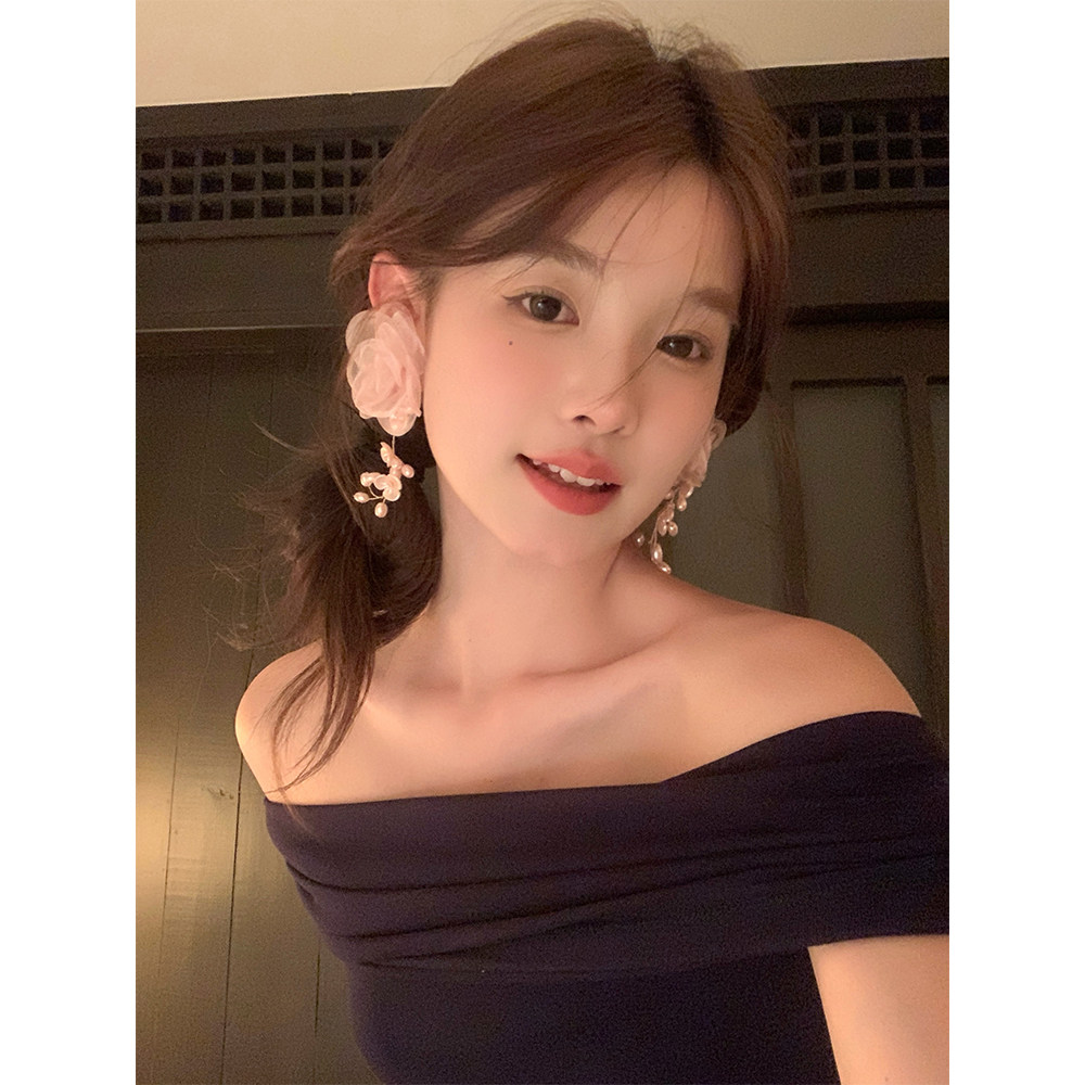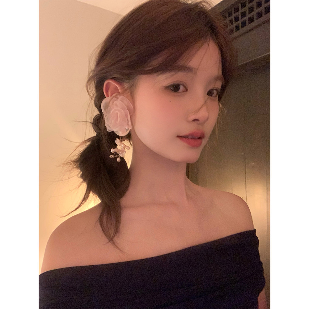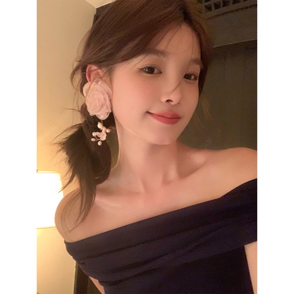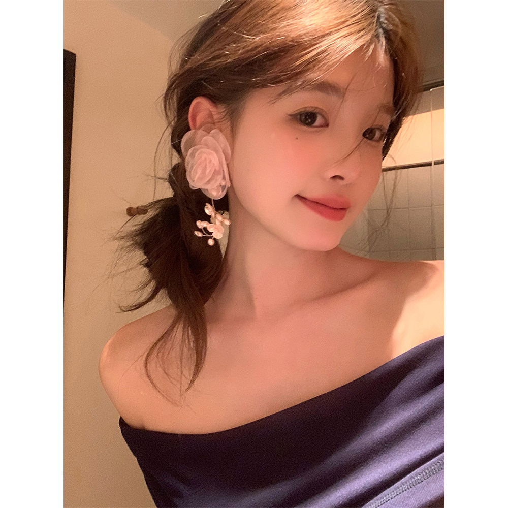 粉色网纱花朵流苏耳环2025超火新款爆款甜美耳钉春夏夸张耳饰女