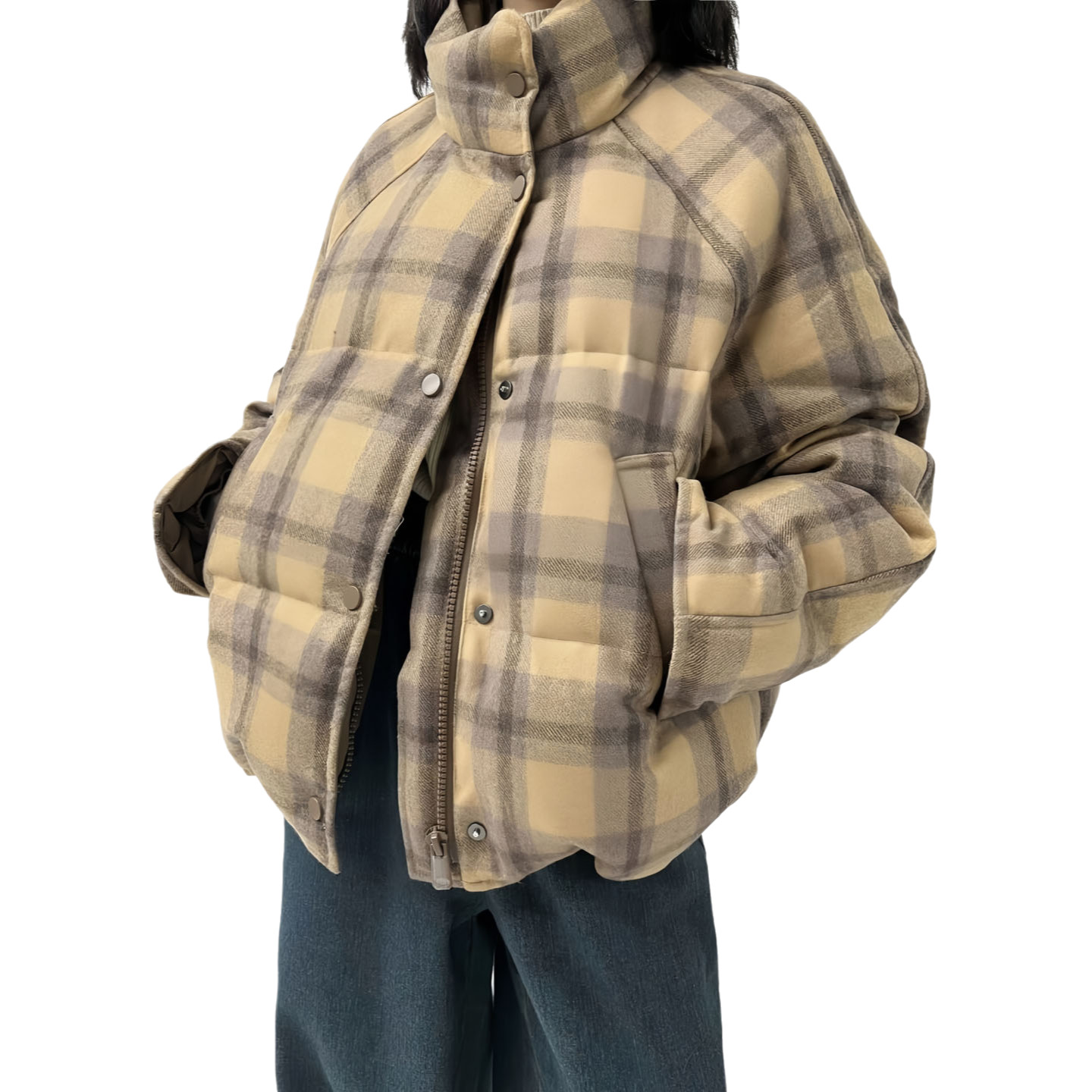 美式潮牌复古格子立领羽绒棉袄女