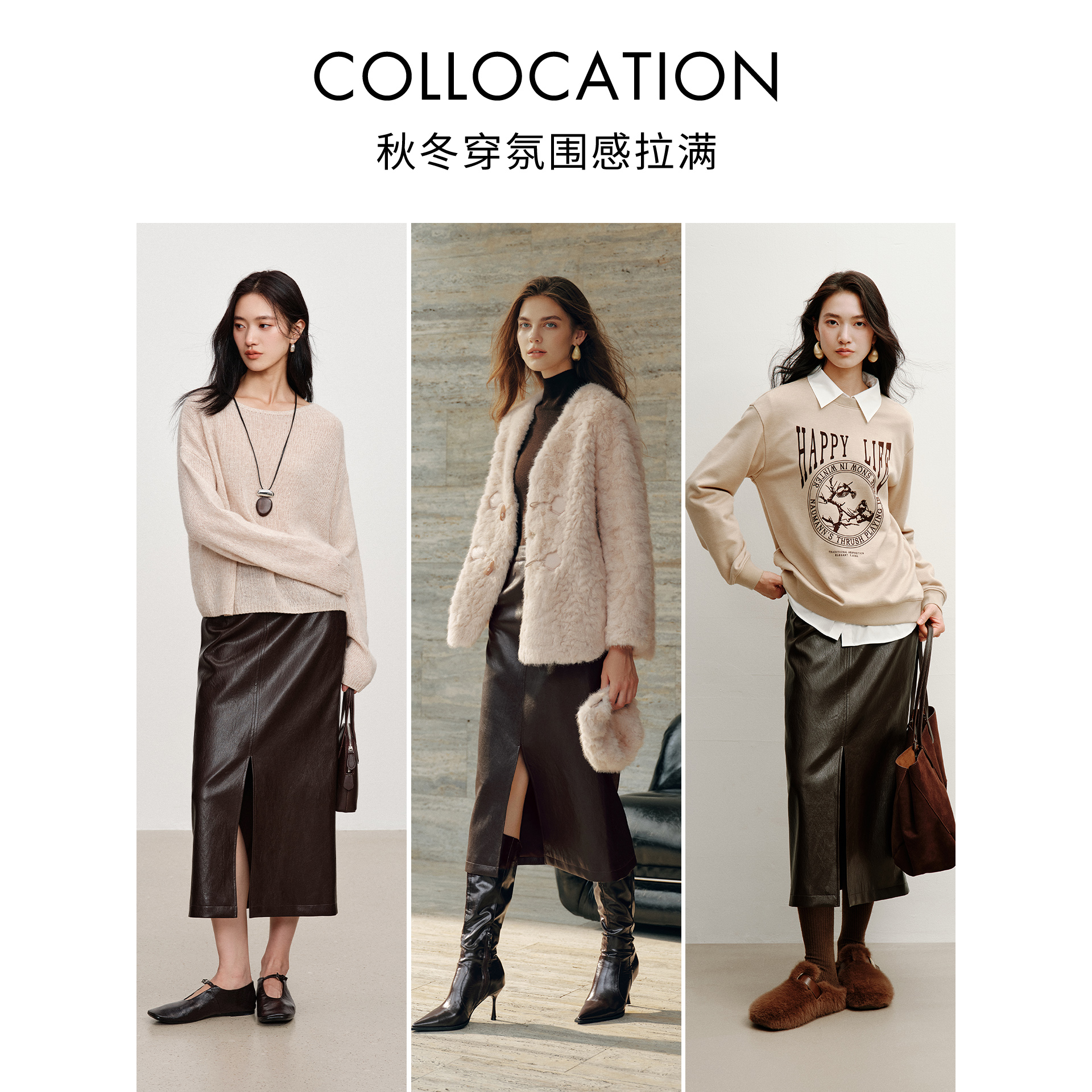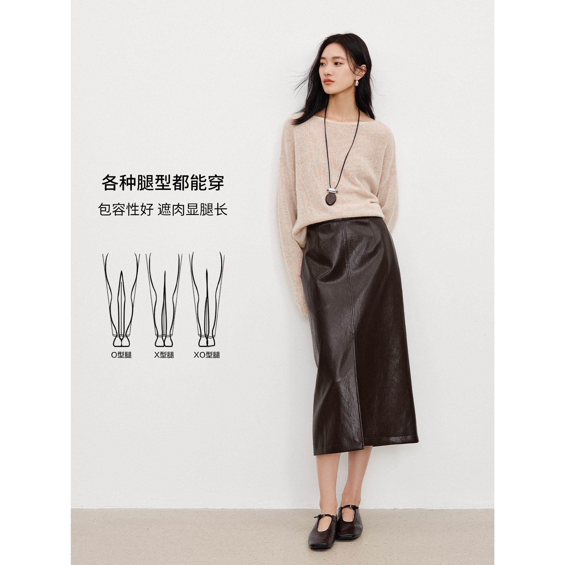 衣香丽影咖色直筒高纤皮裙女2025秋冬装新款显高显瘦开衩半身裙子