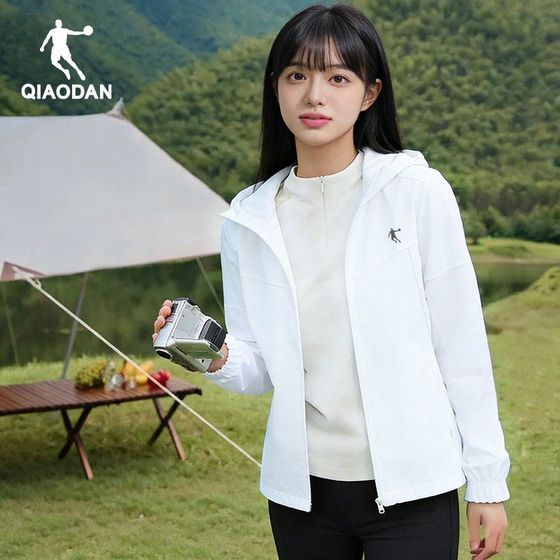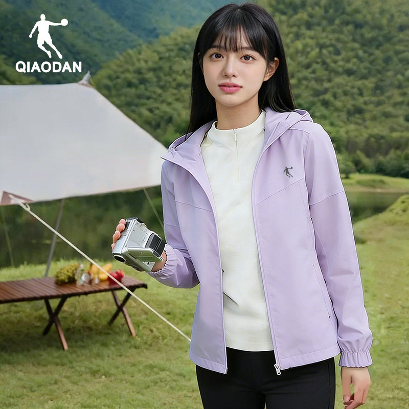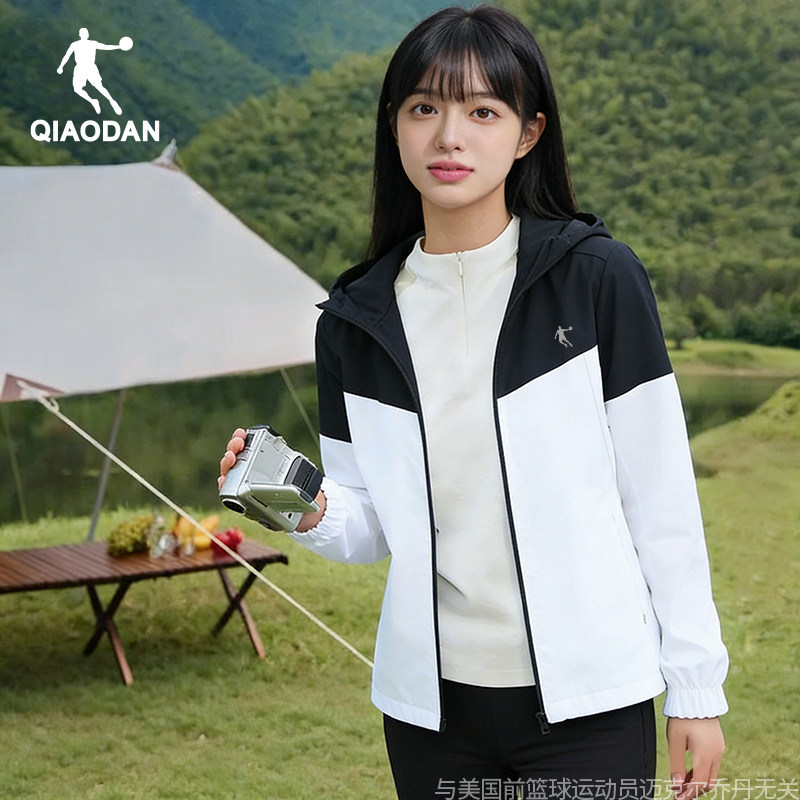 乔丹冲锋衣女款2025新款宽松连帽运动夹克上衣登山跑步风衣外套
