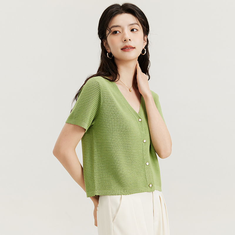 古木夕羊简约纯色V领针织衫女2025夏季新款短袖显瘦显白开衫上衣