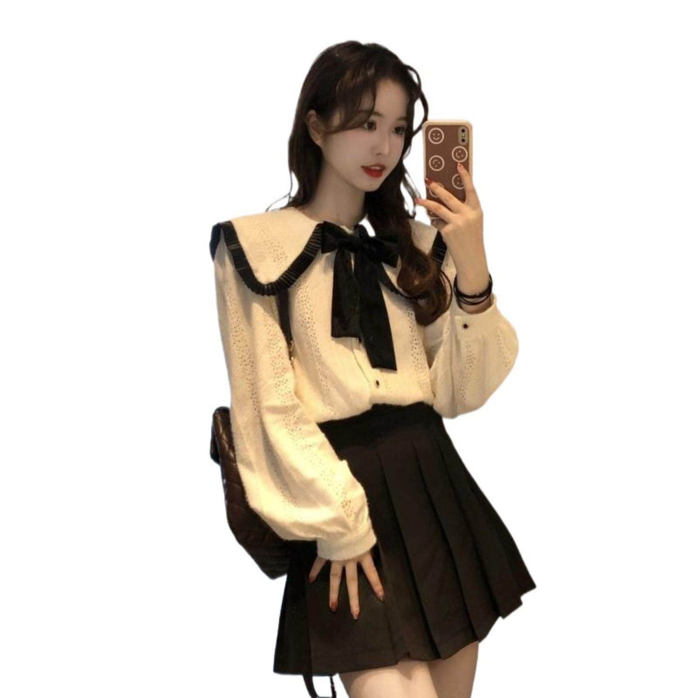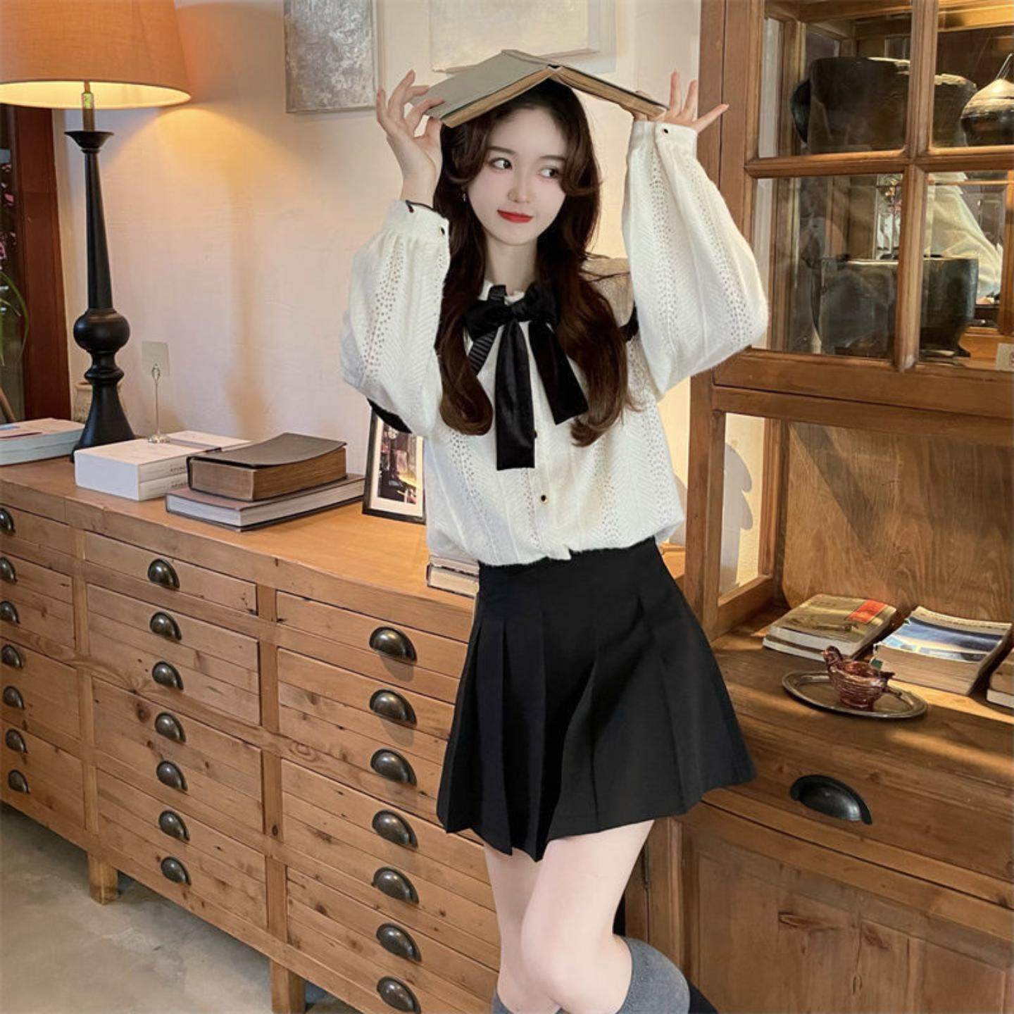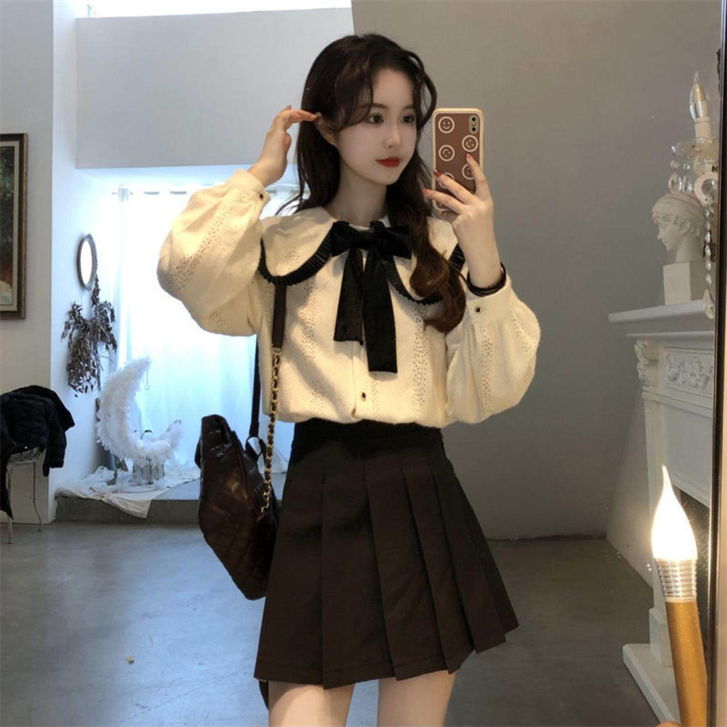 百褶裙套装女春秋两件套裙娃娃领针织衬衫学院风韩系小个子甜美风