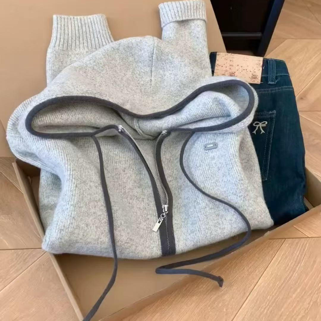 2025秋冬新款韩版宽松连帽拉链毛衣外套女慵懒风宽松针织开衫上衣