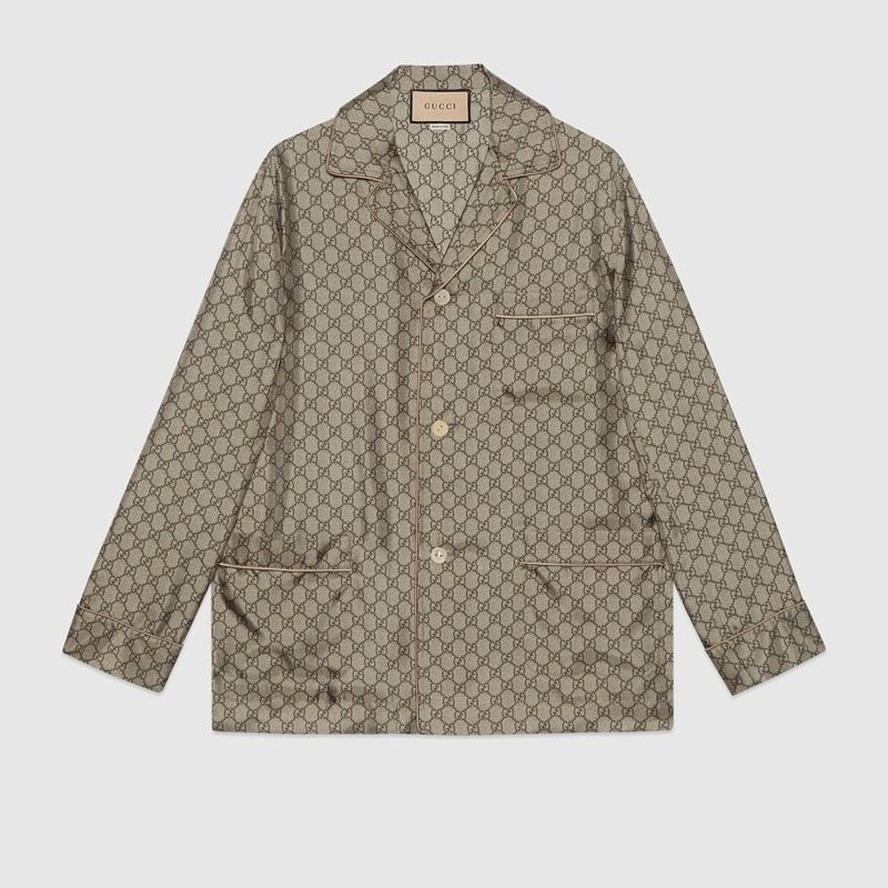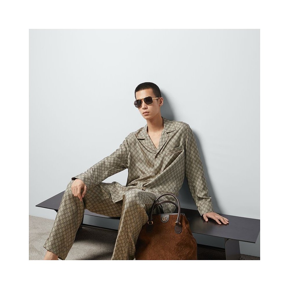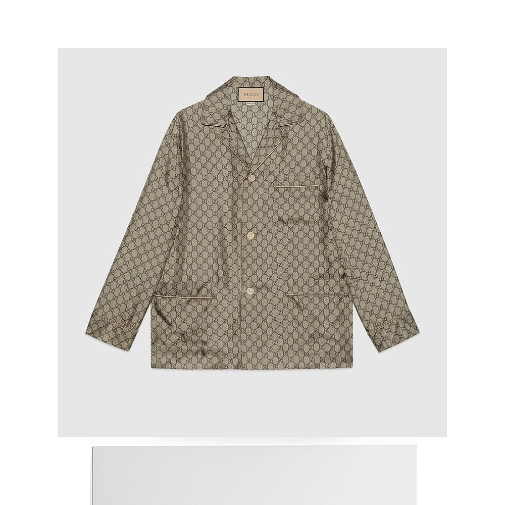 自营欧洲直邮Gucci古驰男士驼色和棕色真丝衬衫