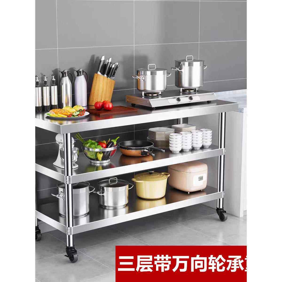 带轮双层不锈钢工作台厨房切菜操作台案板三层加厚不锈钢桌置物架