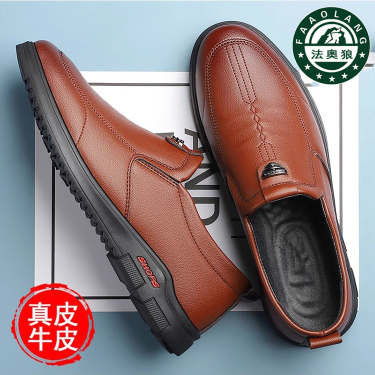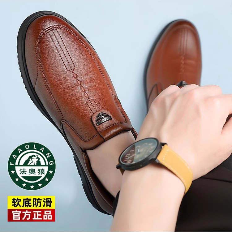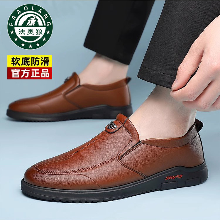 正品法奥狼男鞋春秋季真皮皮鞋男士软底一脚蹬休闲中老年爸爸鞋