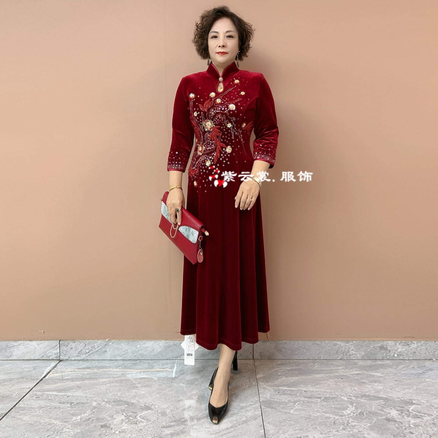 喜婆婆婚宴年轻妈妈婚礼丝绒旗袍结婚喜服平时可穿长款气质连衣裙