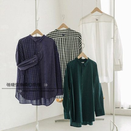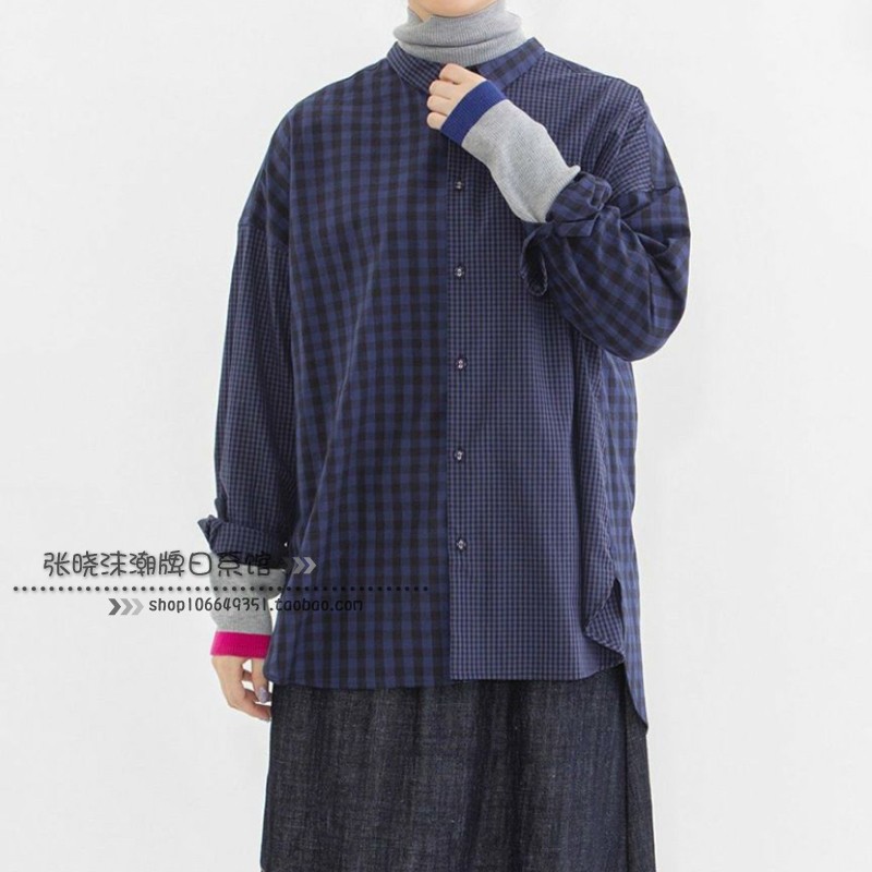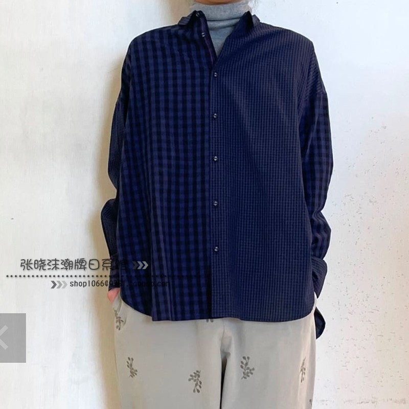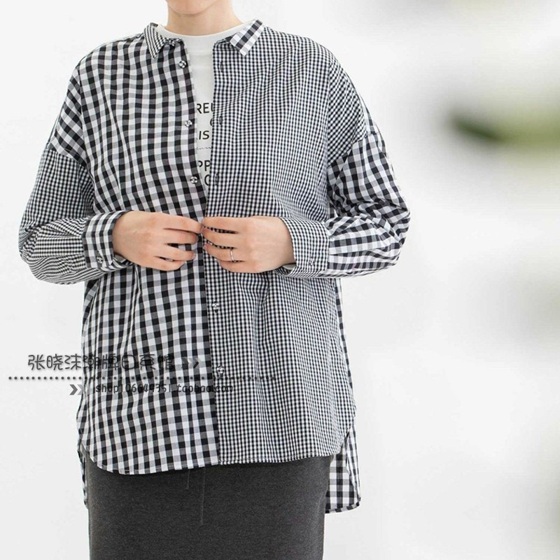 张晓沫日系新品撞色拼接格纹后背刺绣天鹅纯棉长袖衬衫nop上衣女