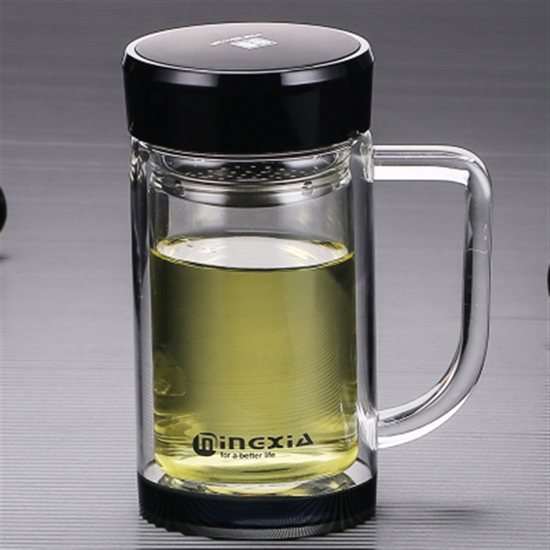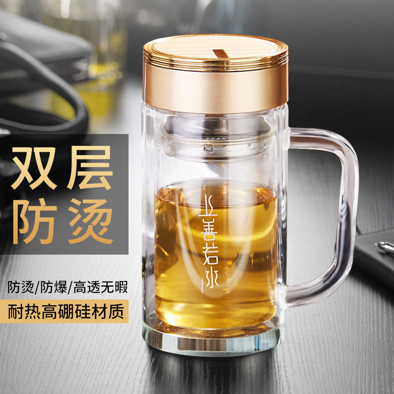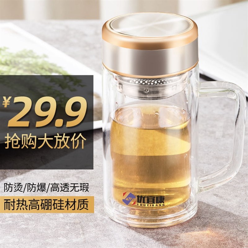 双层玻璃杯男女士办公室高档水杯带把手家用带盖过滤网泡茶杯子