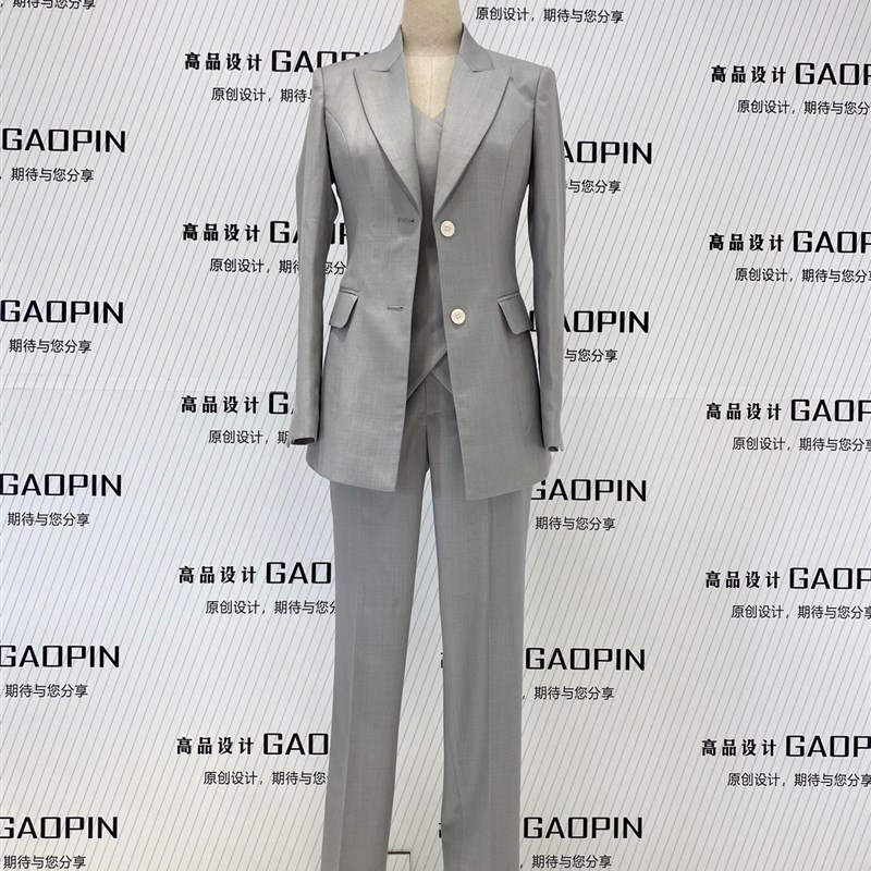 2021年秋季新款浅灰色单排扣三件套西装套装女职业商务小西服外套