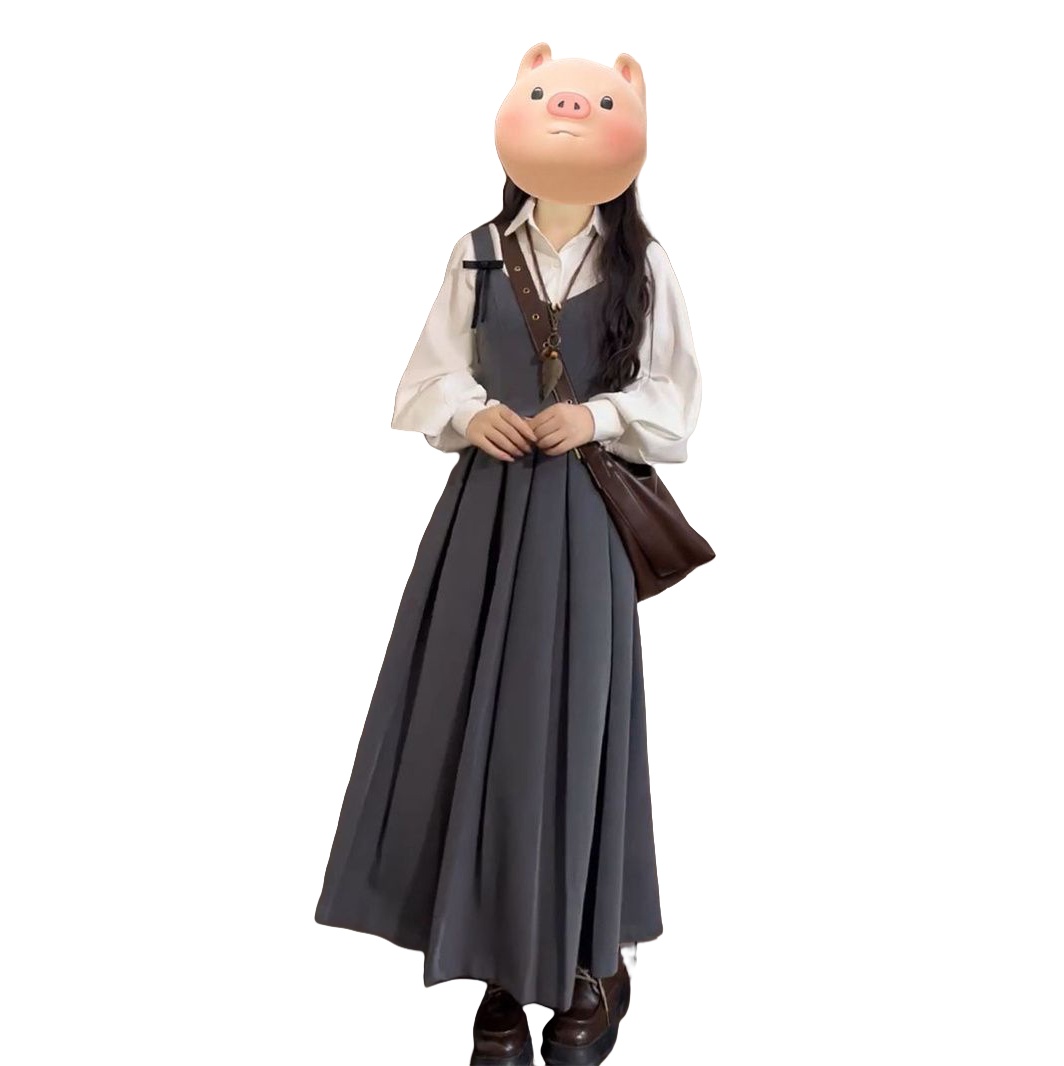 时尚新款温柔学院风假两件拼接连衣裙搭配白色衬衫两件套装送领结