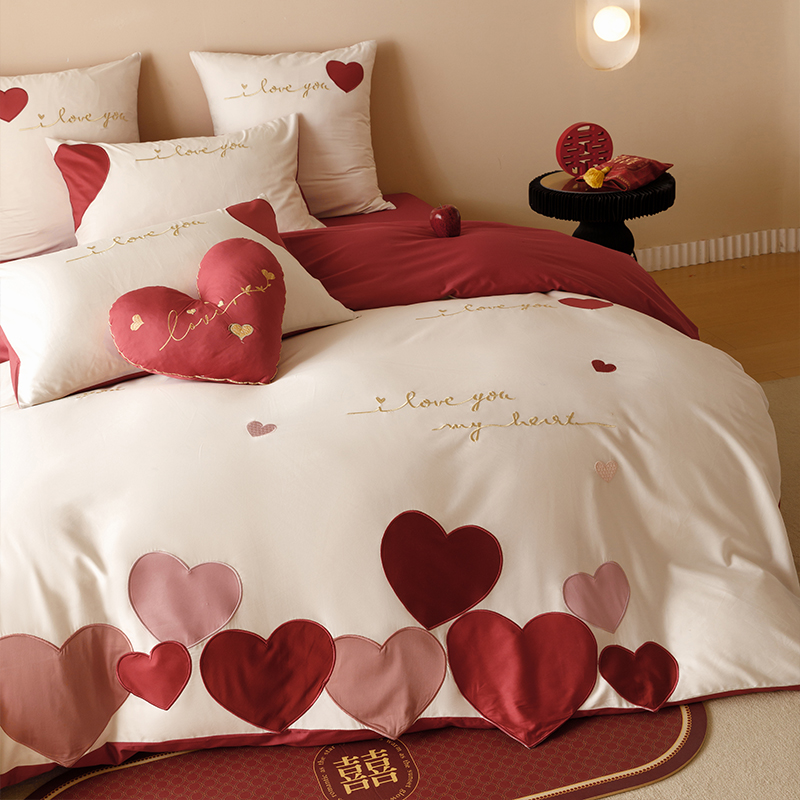 高级感温馨婚庆100S澳棉四件套爱心刺绣全棉被套床单纯棉陪嫁床品